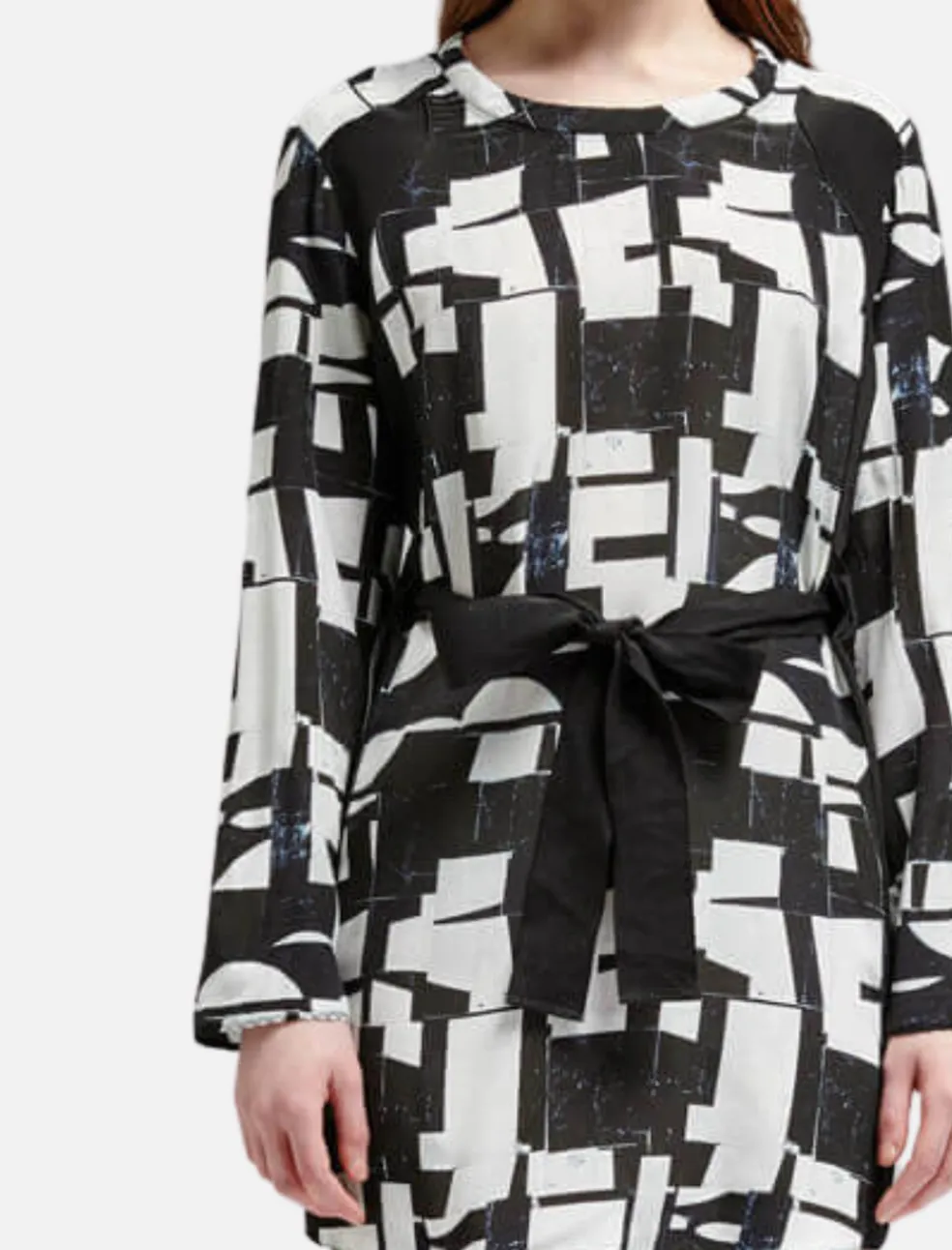 The Accola Dress by IRO features a bold black and white graphic print with black side panels and a grosgrain belt, that weaves through the dress. Long sleeved, this dress features a crew neck and shirttail hem. Easily paired with a pair of strappy heels or your favourite boots.