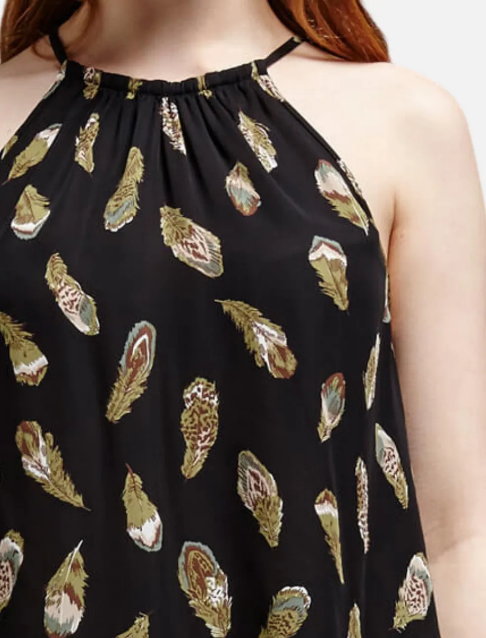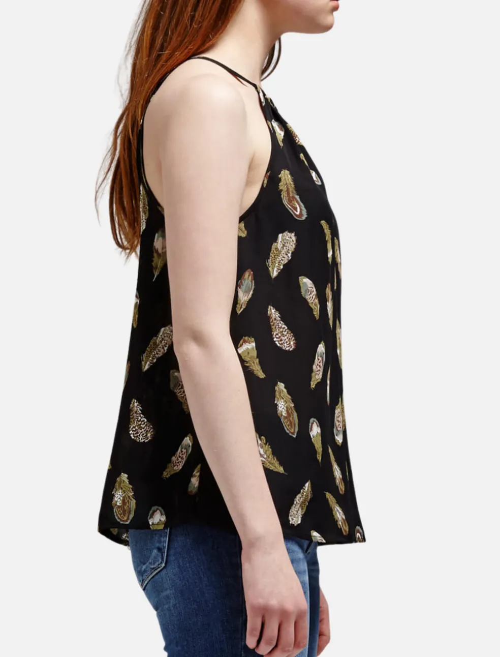 The Alabama Halter Neck Tank from Joie is a beautiful matte black Silk tank that features an illustrated floating feather design. This tank is feminine and flowy, and has a gathered halter neck with thin straps. A relaxed fit, this tank also features a back keyhole detail.