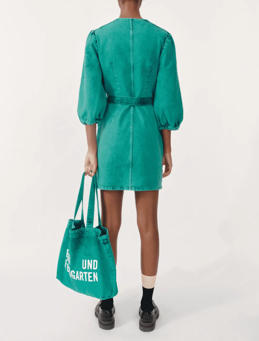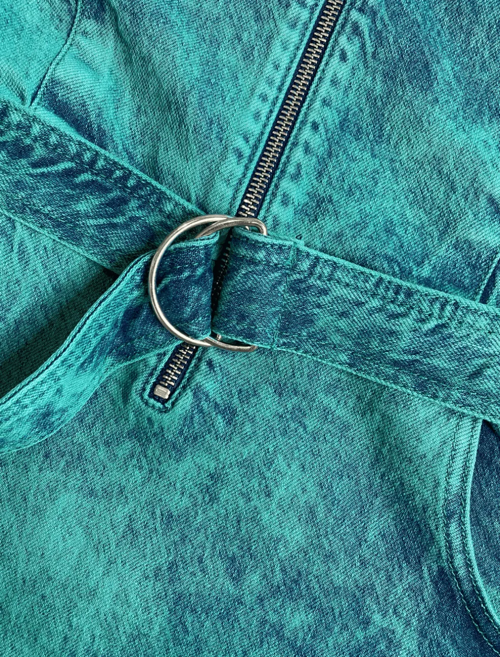 This fun 80’s inspired denim dress will make you think you attend Euphoria High School. With attitude to spare the bright turquoise acid wash dress features a balloon sleeve, exposed metal zip, self fabric waist tie and from pockets. Team up this Baum Und Pferdgarten dress with your grungiest boots for a killer combo.