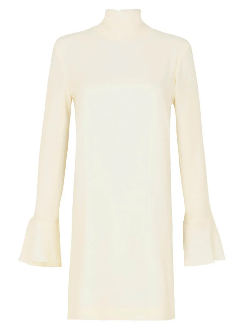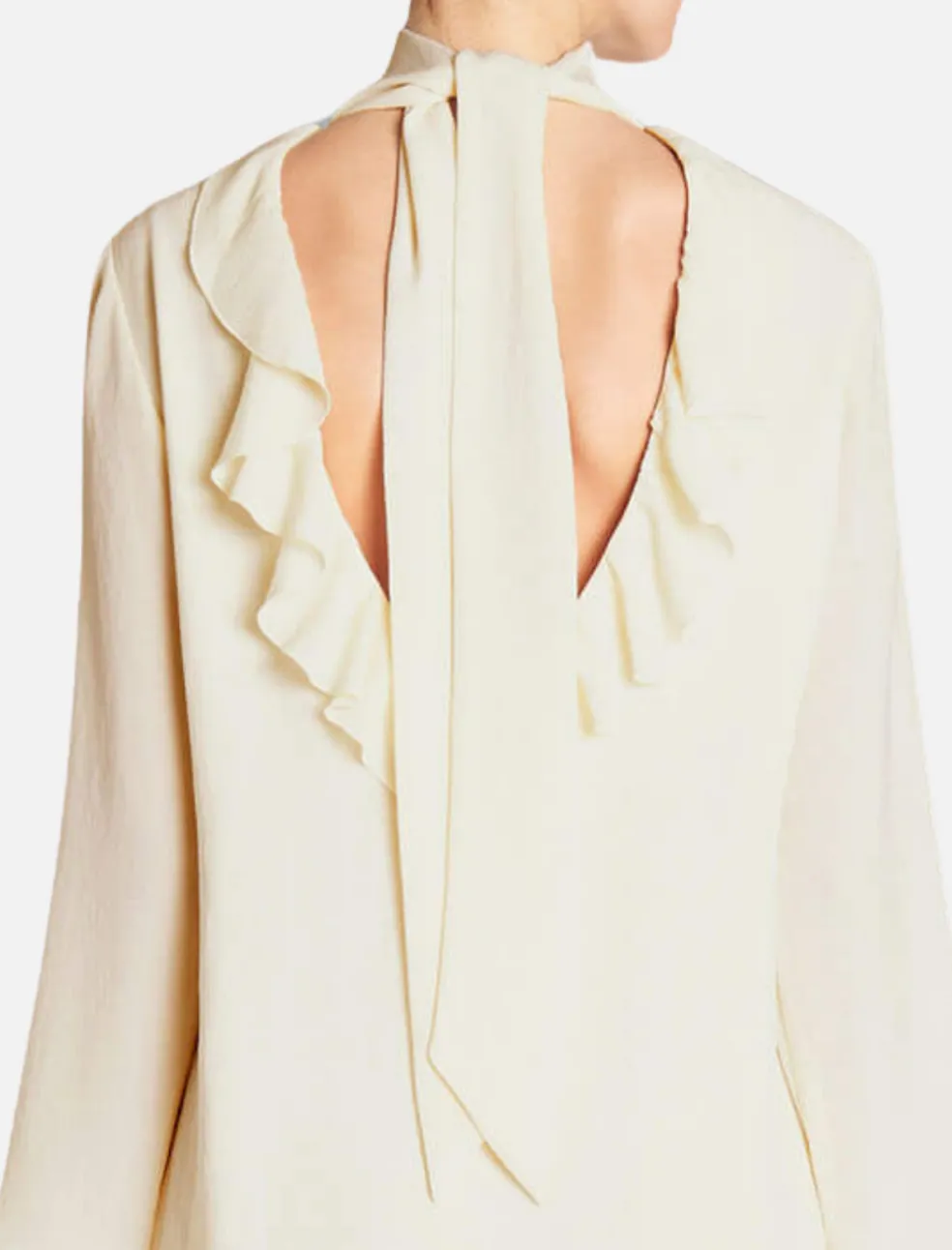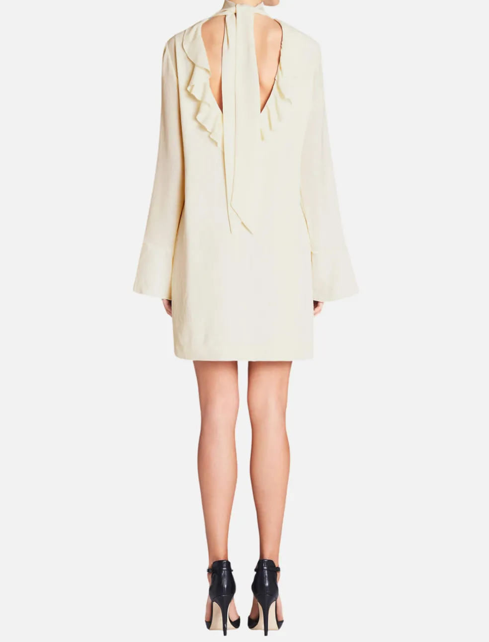 The IRO Anna Dress is the ultimate combination of daring and demure. The deep back neckline and low back show off just the right amount of skin, while the ruffled trim, neck tie accent, and flared sleeves add an element of sweetness to this ultra-chic dress.