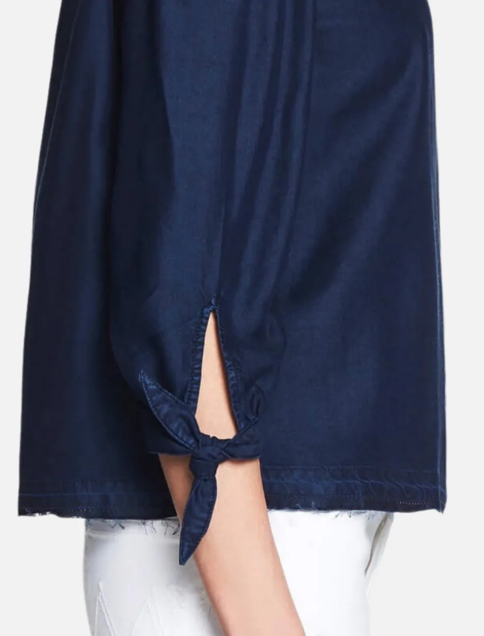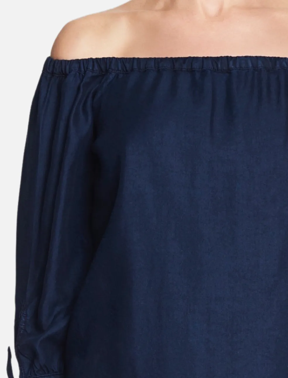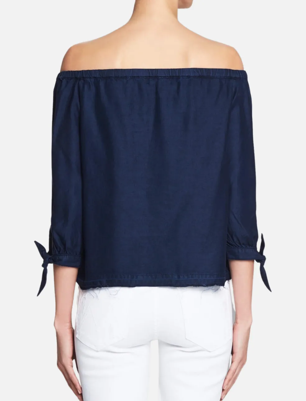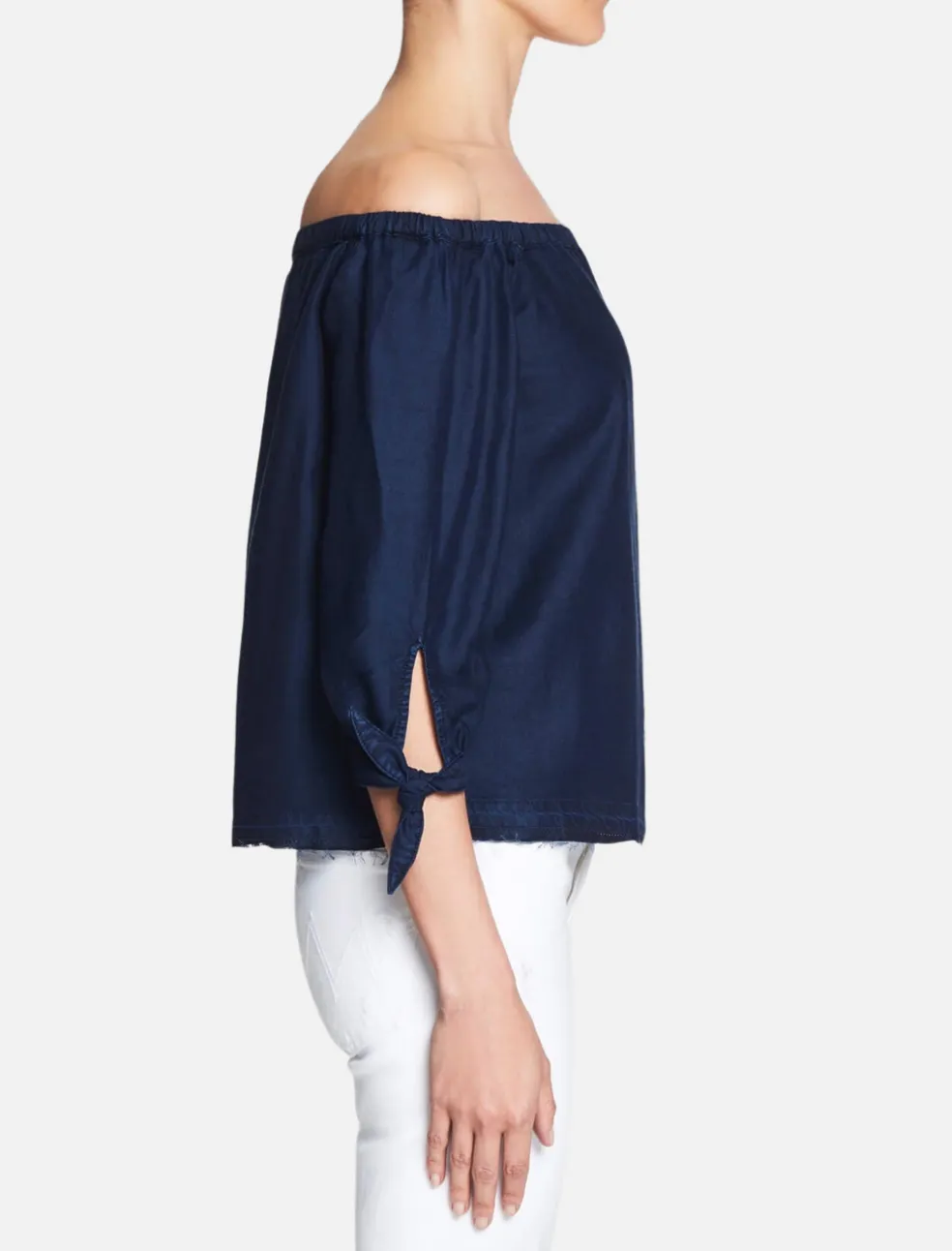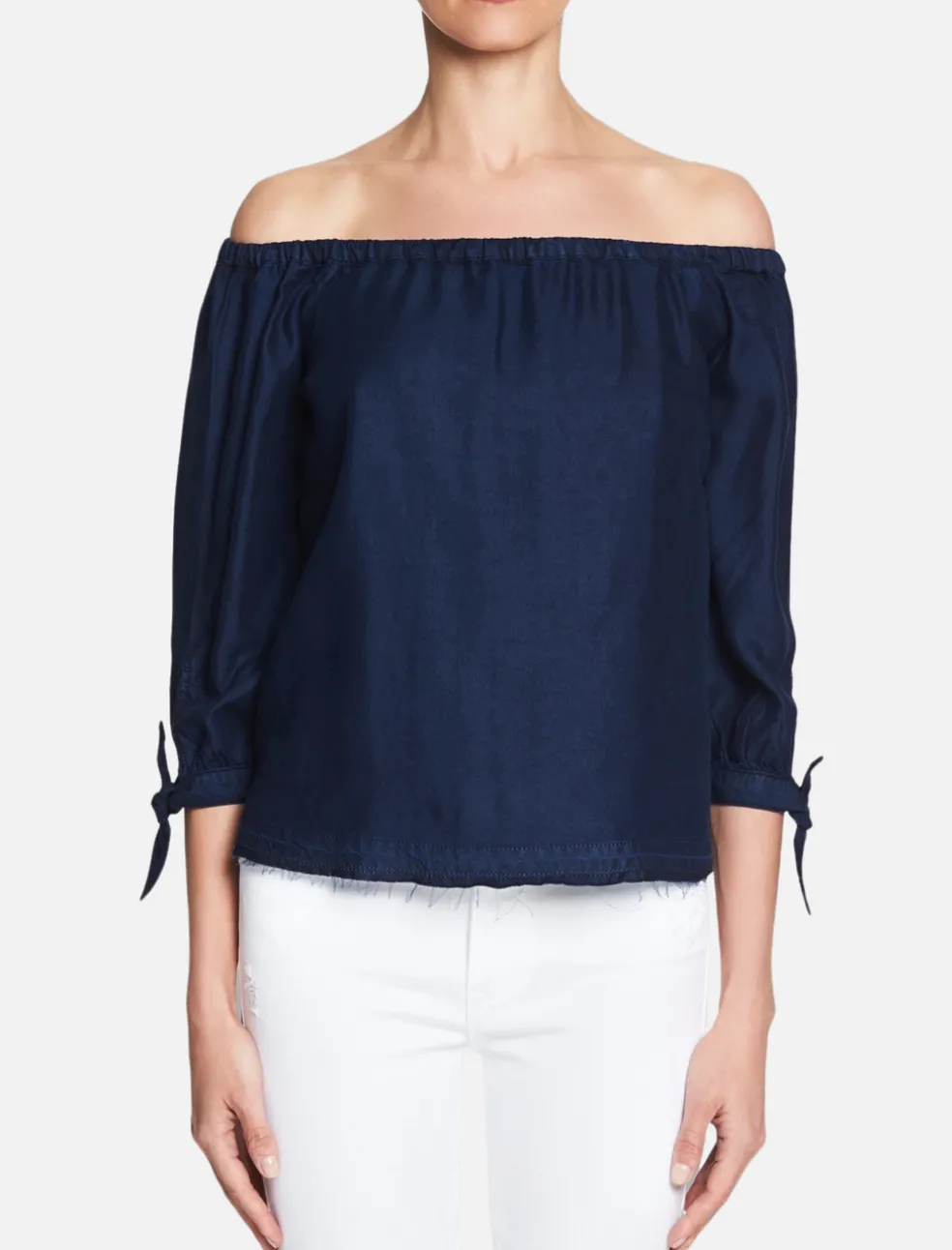 The Paige Antonia Top is the perfect effortlessly chic piece for the warmer months. Constructed from a soft and lightweight tencel this off the shoulder piece features 3/4 length sleeves that finish with a refined tie cuff and an ultra cool undone hem with natural fraying. The deep blue wash makes this top the perfect match for your favourite light denim jeans or a little black skirt.