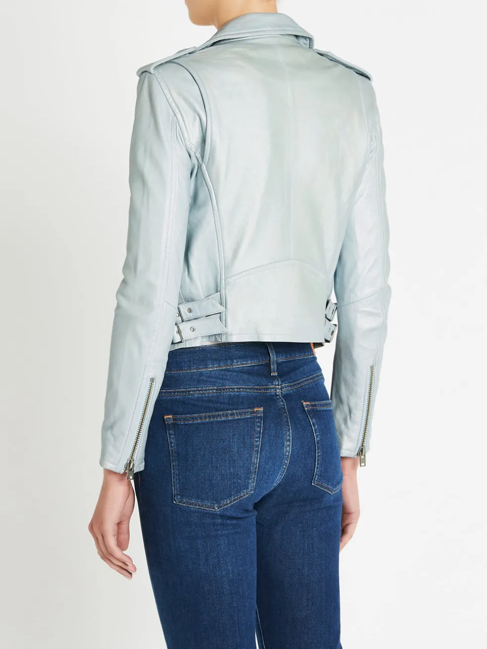 The Iro Ashville Jacket is an absolute must have addition to any wardrobe and comes here in the colour Azur Blue. This super soft leather jacket features twin adjustable fixed waist belt buckles, a small triangle pocket on the front, snap-fastening epaulettes, and classic silver hardware. Fully lined.