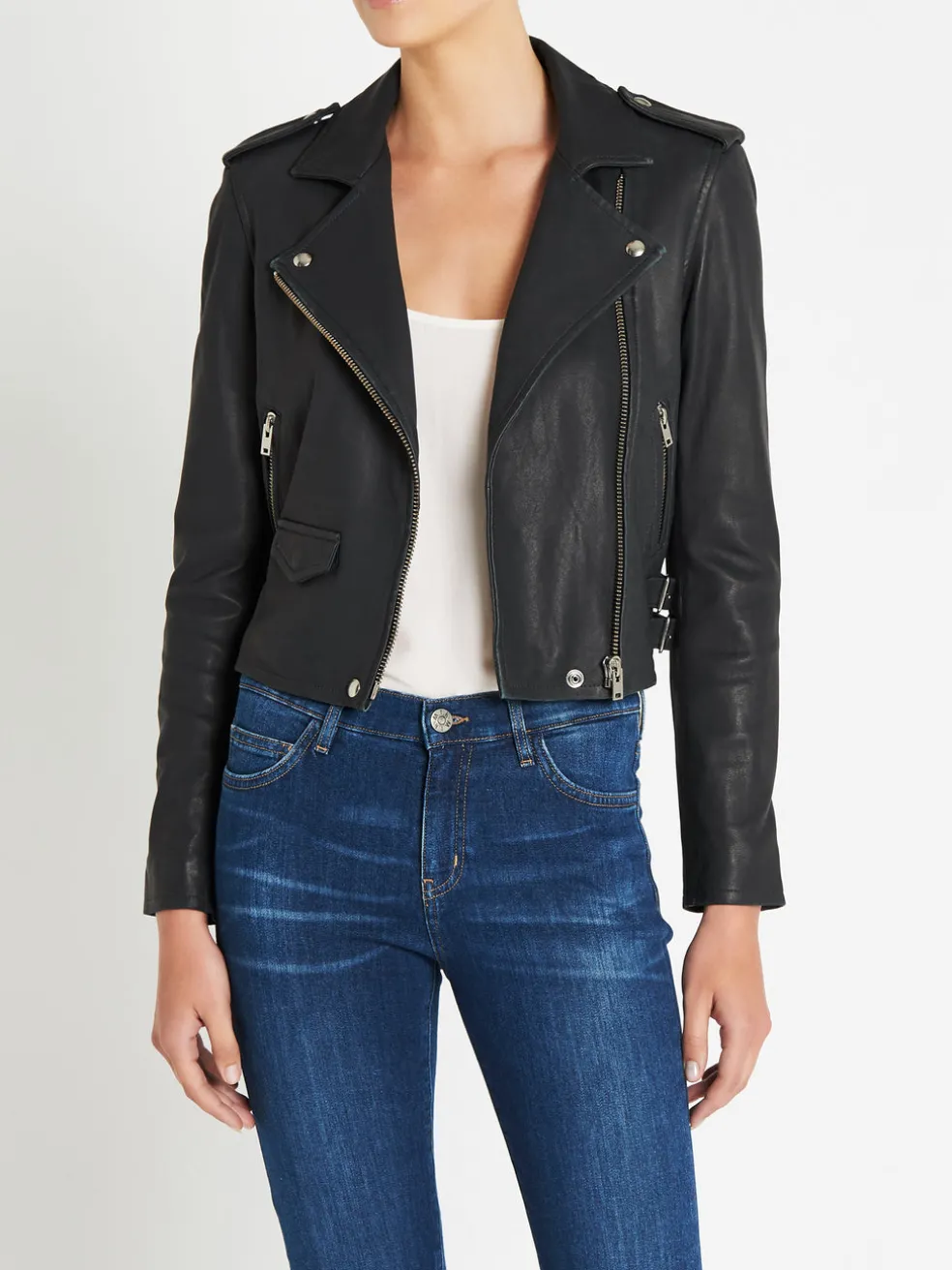 The Iro Ashville Jacket is an absolute must have addition to any wardrobe and comes here in the timeless colour grey denim. This super soft leather jacket features twin adjustable fixed waist belt buckles, a small triangle pocket on the front, snap-fastening epaulettes, slight fading on the edges and classic silver hardware. Fully lined.
