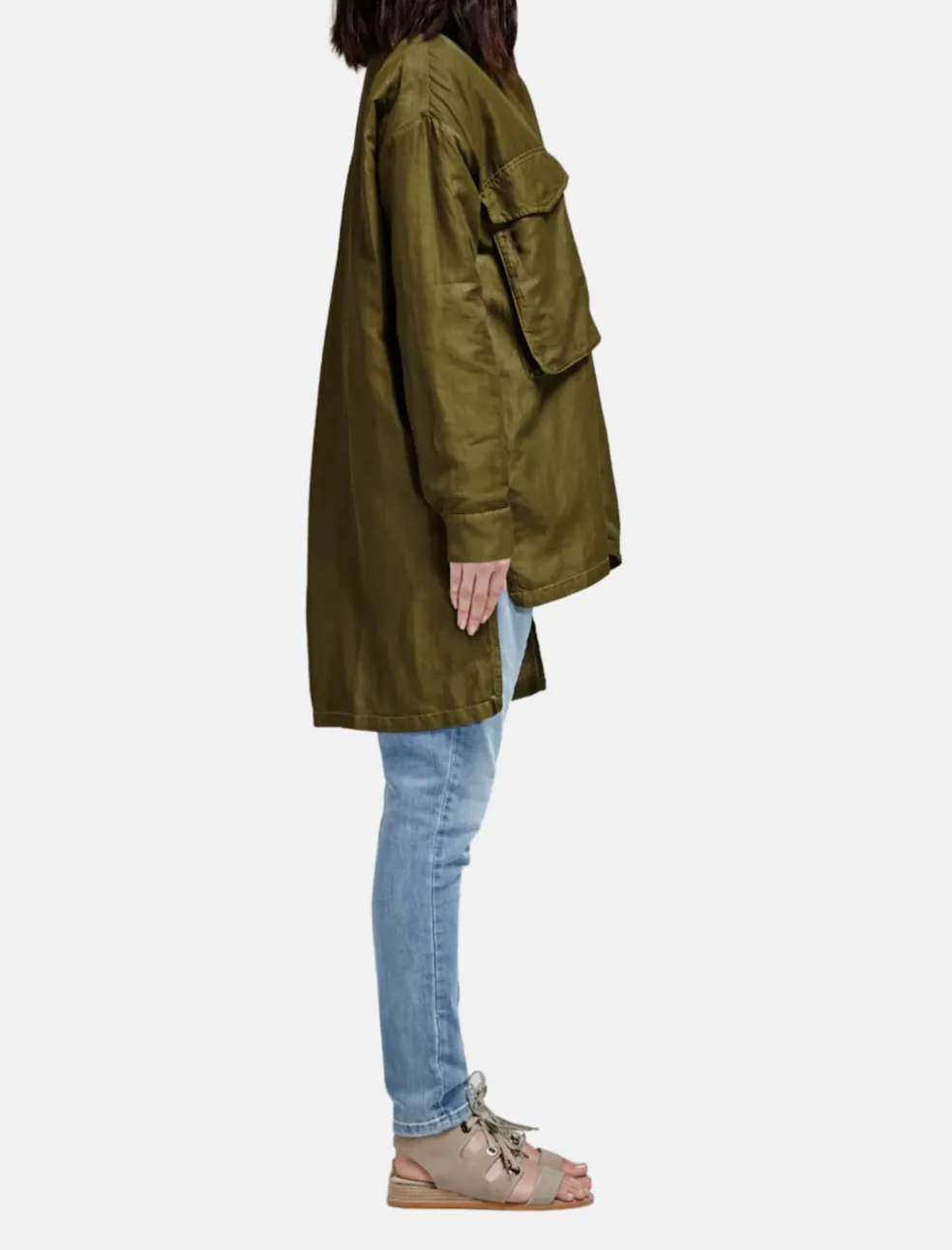 The Beckals Jacket from Rebecca Minkoff is a military inspired jacket with a subtle grunge vibe – it is a deep army green colour, and features tarnished gold hardware, utility pockets and dual side pockets. This jacket is an oversized fit, has a hidden front zip closure, a slight side split and a single back pleat.