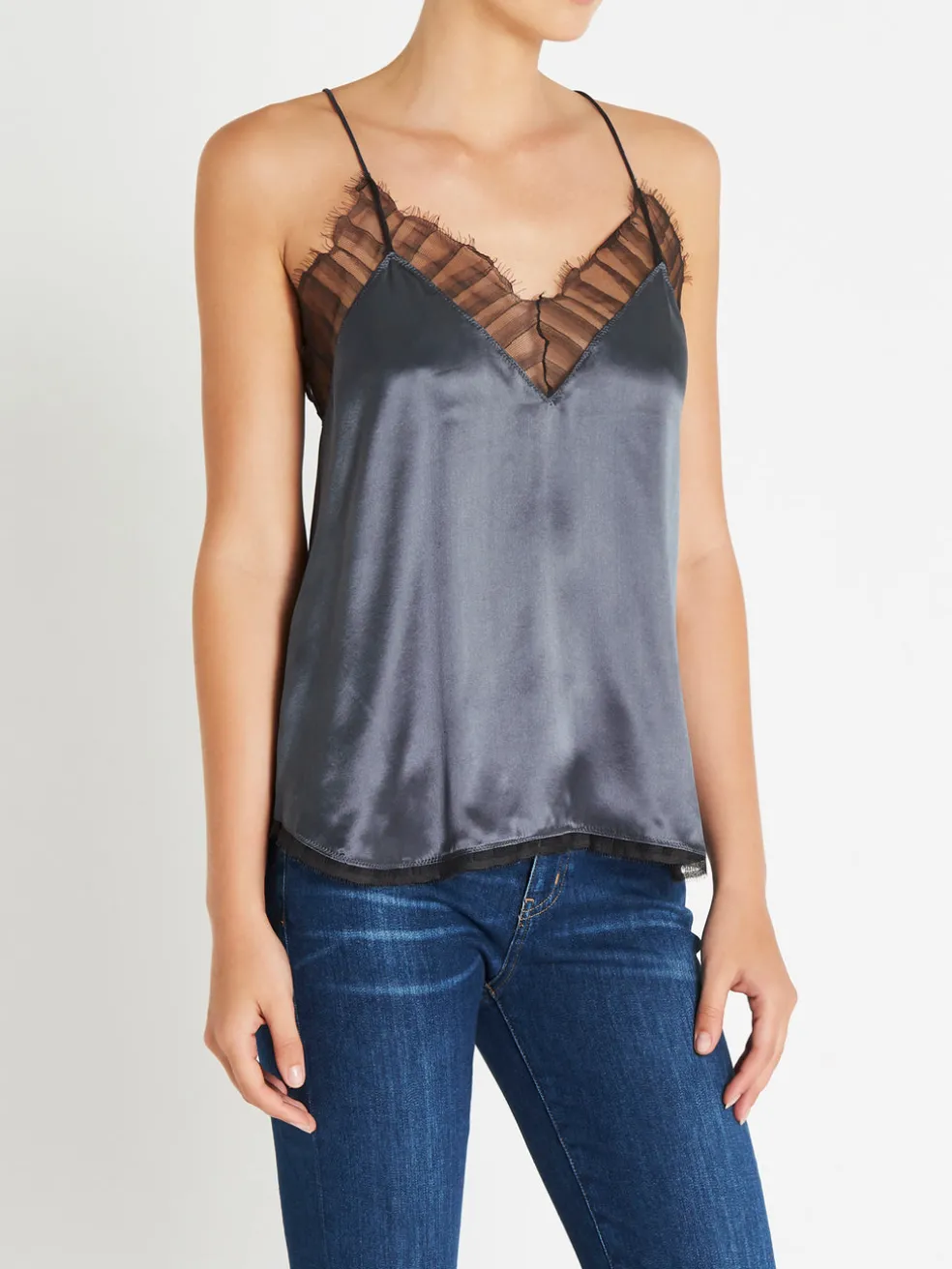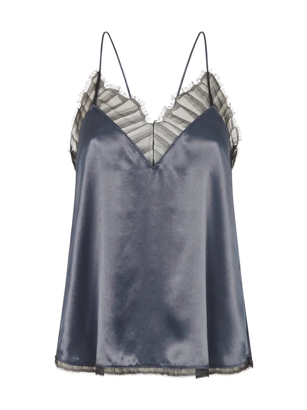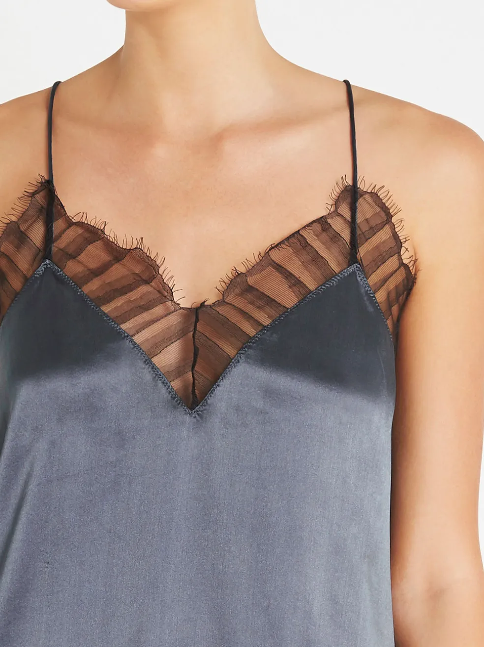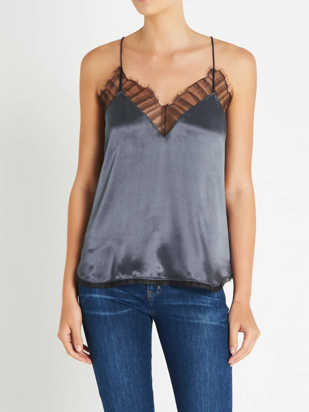 The perfect little cami to spice up your wardrobe. The Berwyn Cami by IRO is constructed from an ultra soft and lightweight silk and comes here in the colour grey; this camisole features a draped silhouette, spaghetti straps, v neckline and racer back. Lace trims adorn the neckline and scalloped hem to finish the piece. Wear yours over a black bralette tucked into a leather skirt or slip over a simple tee with jeans for a more casual look.