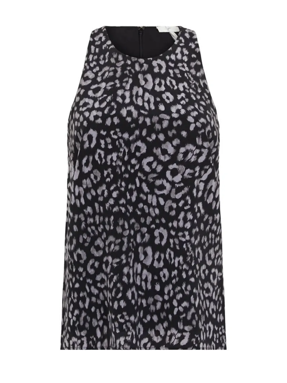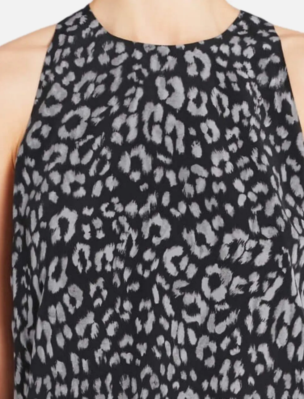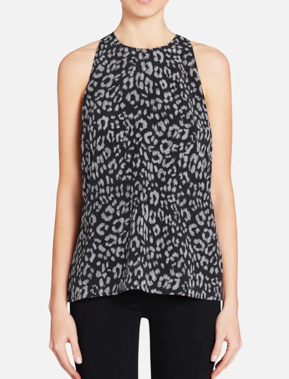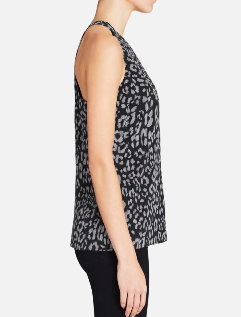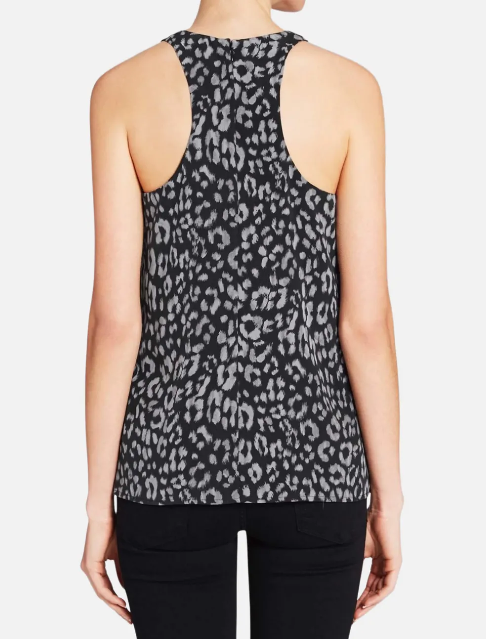 The Joie Brighton Tank in Dark Leopard print has a high round neck, a racerback and invisible zip closure.