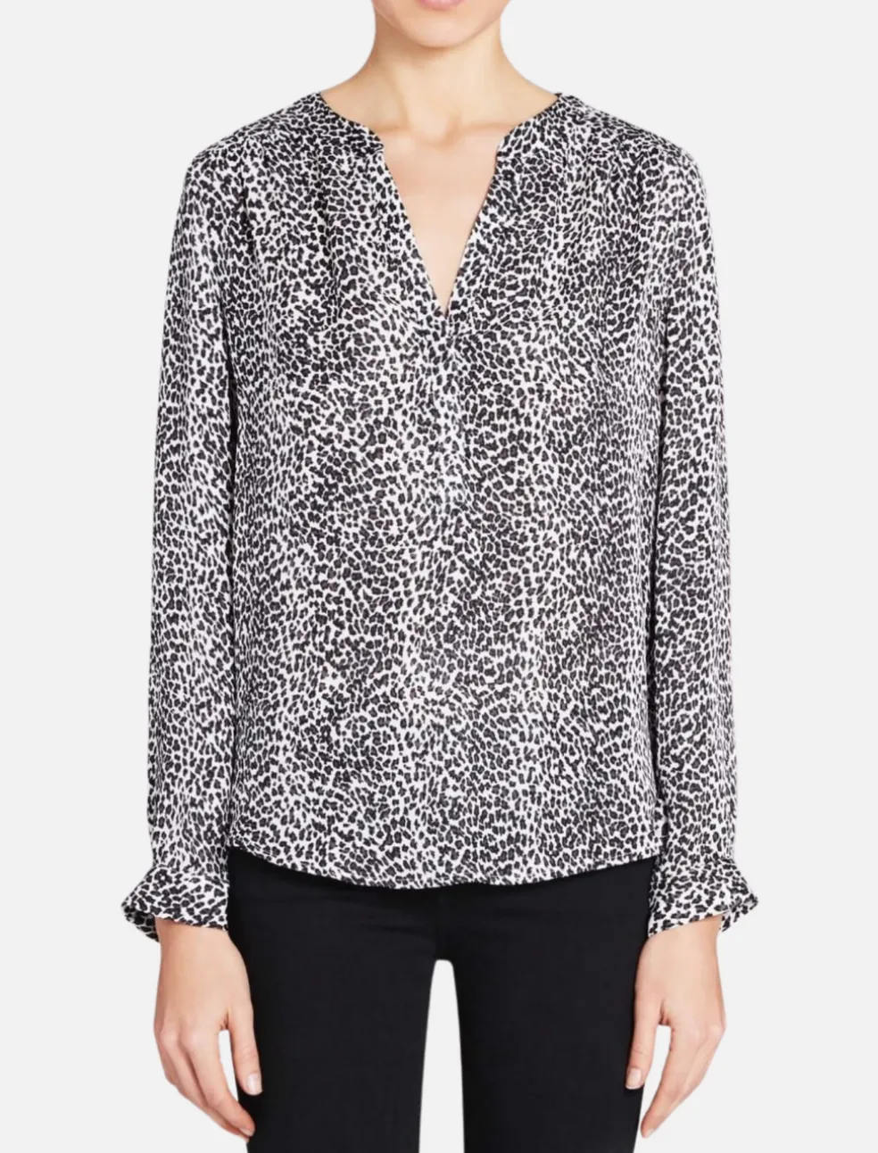 Indulge in the subtle allure of the Joie Carita blouse, where a delicate leopard print in shades of white and grey takes center stage. This elegant piece showcases a banded open split V neckline, adding a touch of sophistication to your ensemble. With long sleeves graced by button cuffs, this blouse seamlessly balances comfort and style.