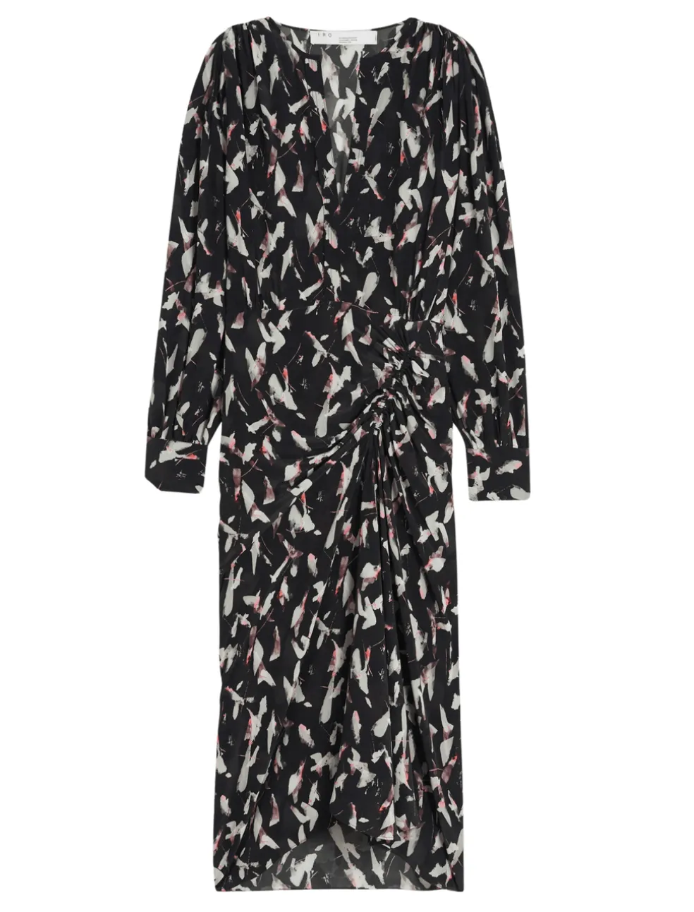 The IRO Carola Dress in Black/Ecru is the perfect dress for a cold wintery day. The long sleeves and fitted waist combine into a faux wrap style skirt with a subtle split that is extremely flattering. The all-over pattern is reminiscent of birds in flight. Other details included buttoned cuffs, pleated shoulder details and a flat taped V Neck line finish.