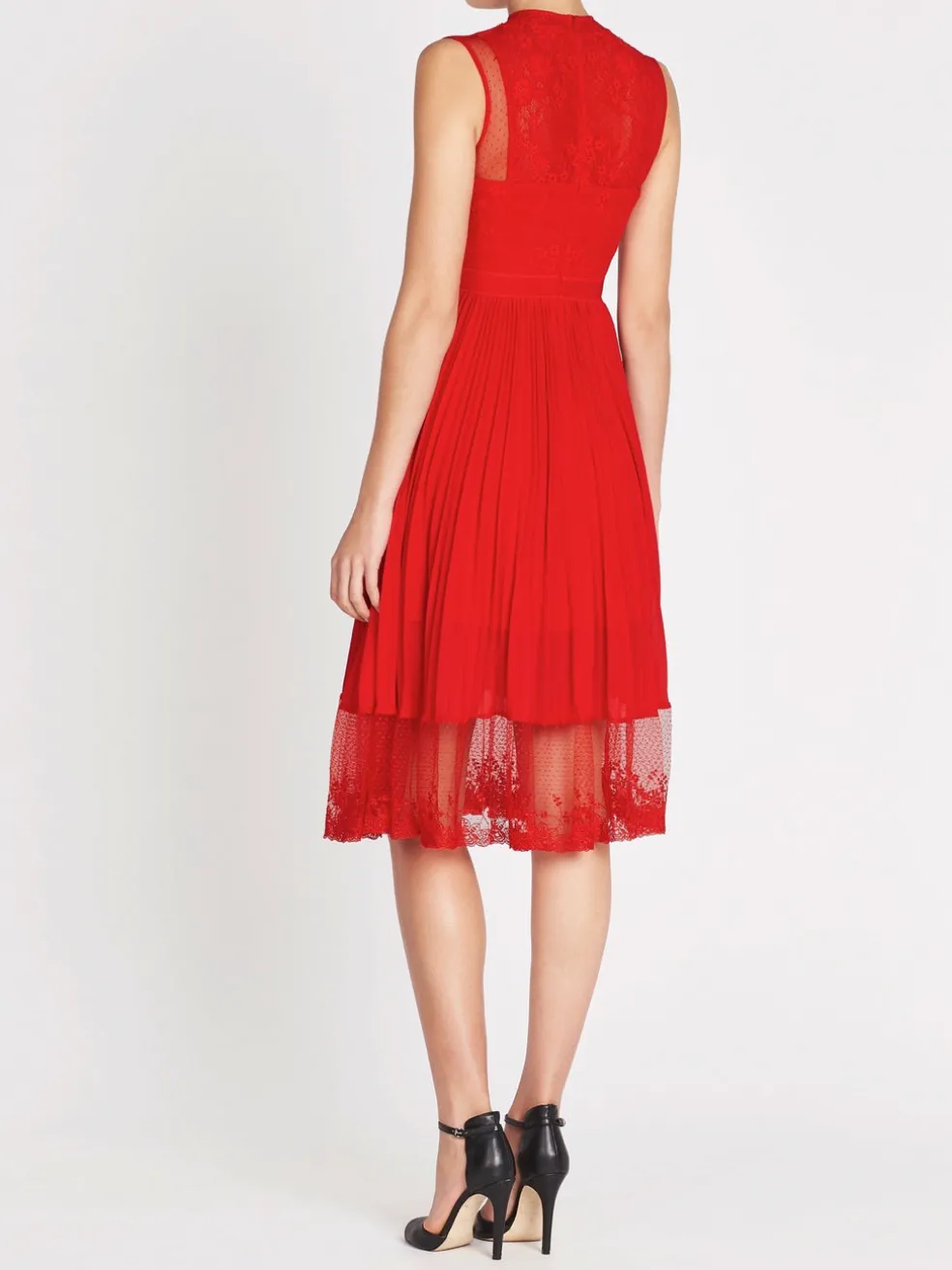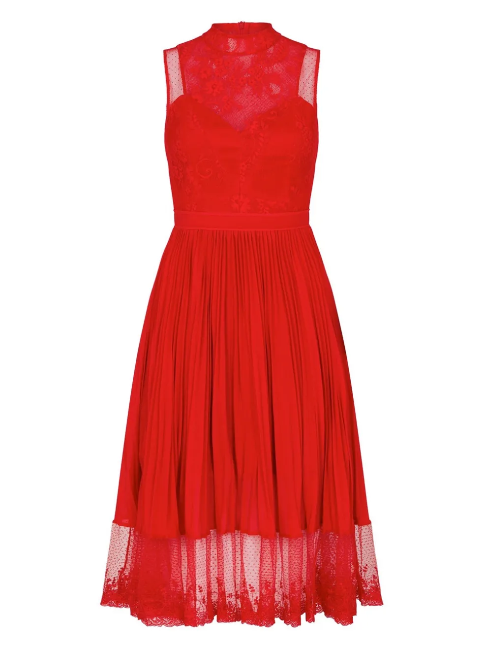 Knock them dead in the Three Floor Cherry Ripe Dress. This stunning red dress features a graphic inspired lace paneled bodice with a high neckline and sheer cut away shoulders details. The bodice transforms into a pleated A-line style skirt with a sheer lace hemline finish. Invisible back zip closure.