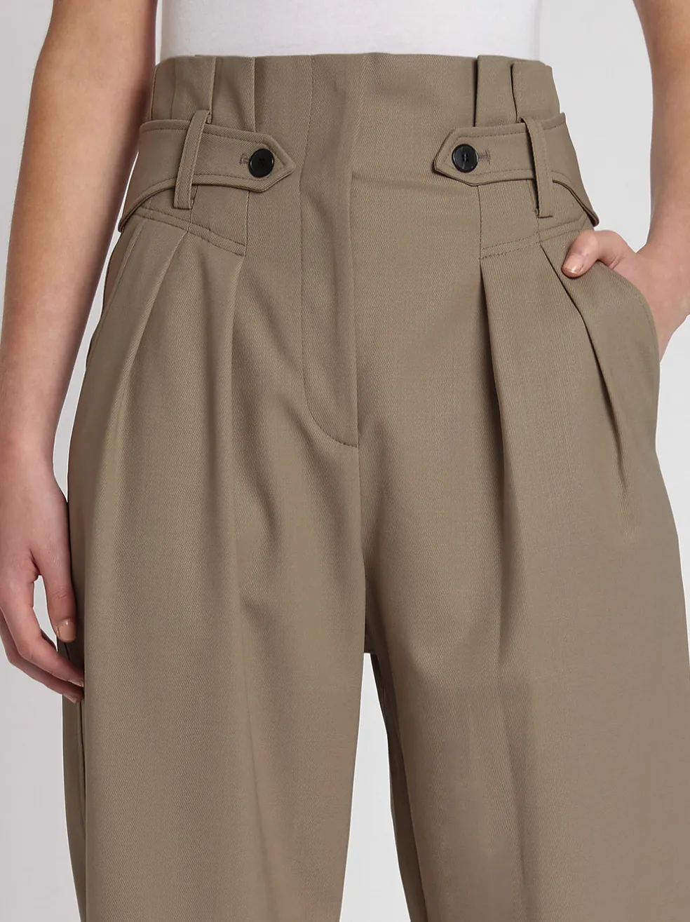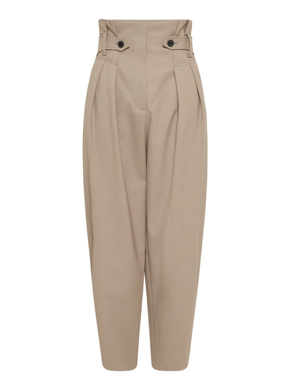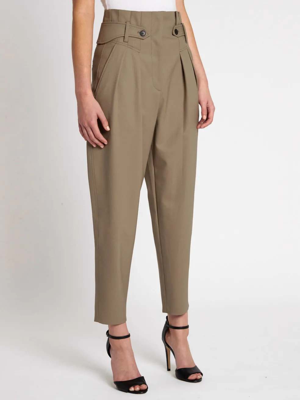 Constructed from a stunning Khaki wool the IRO Chiqui Pant are a must have addition to your wardrobe. These long line pants feature a high waist, side pockets with utility lapels, an invisible side zipper and soft front darts. Team with a strappy heel and you favourite racer back tank for a timeless look that will go from the office to the bar with ease.