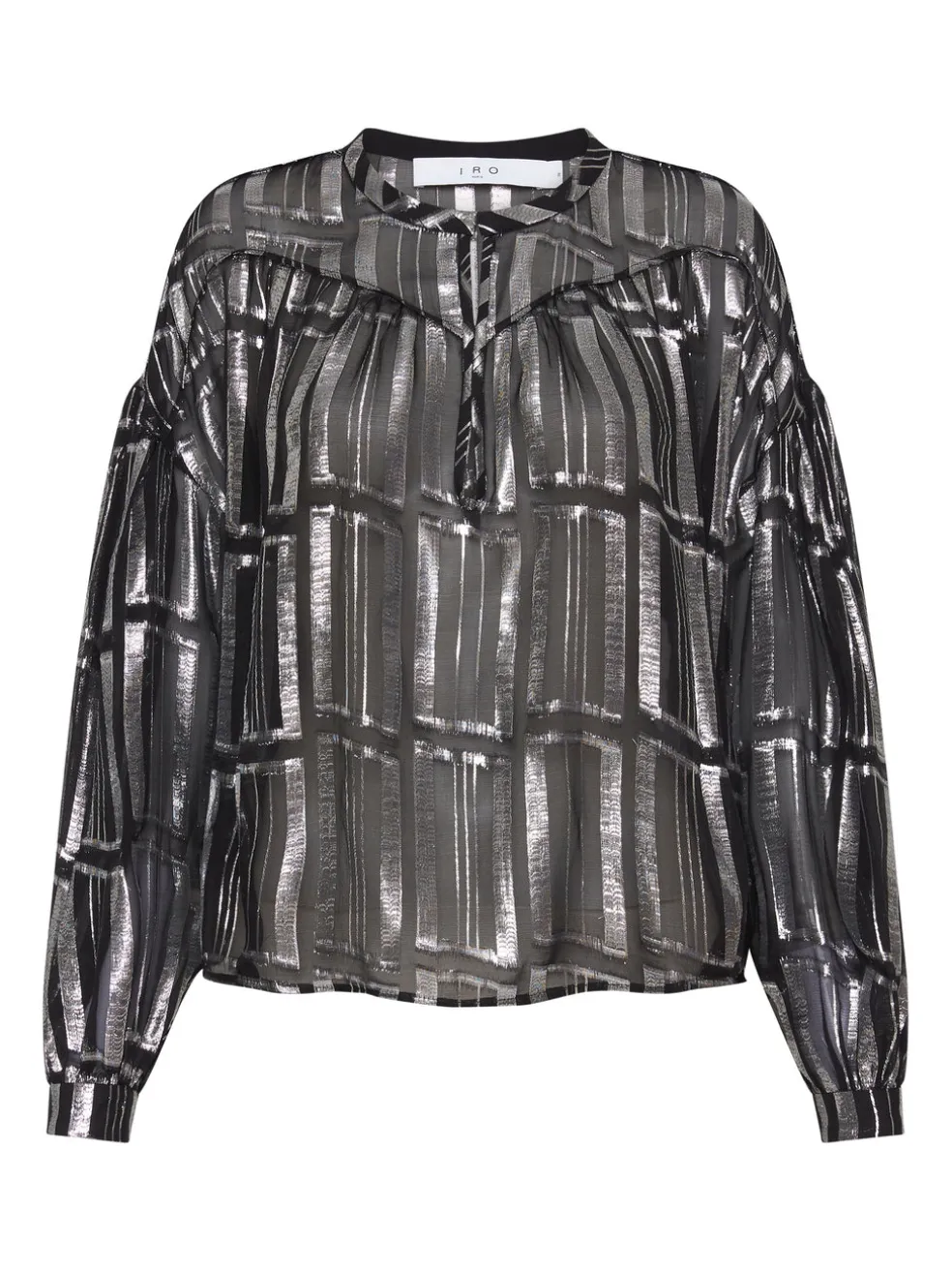 A delicate tunic style top in a dynamic black and silver fabric. The IRO Clari Top is a stunning silk blouse perfect for a night out or a special event at home. The high crew style neck can be worn undone to show off your décolletage, the top is finished with a peasant style body allowing for flow and movement and a dropped sleeve with some volume that tapers to a buttoned cuff.