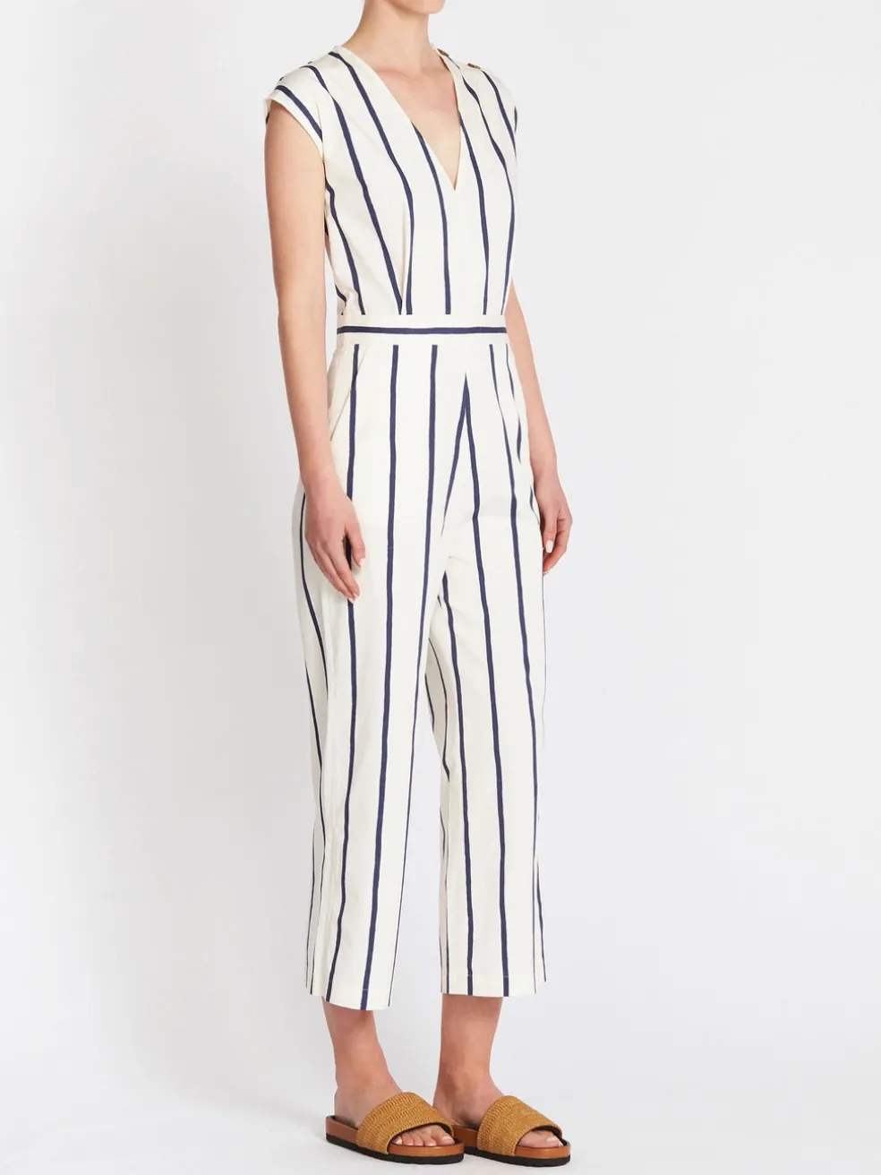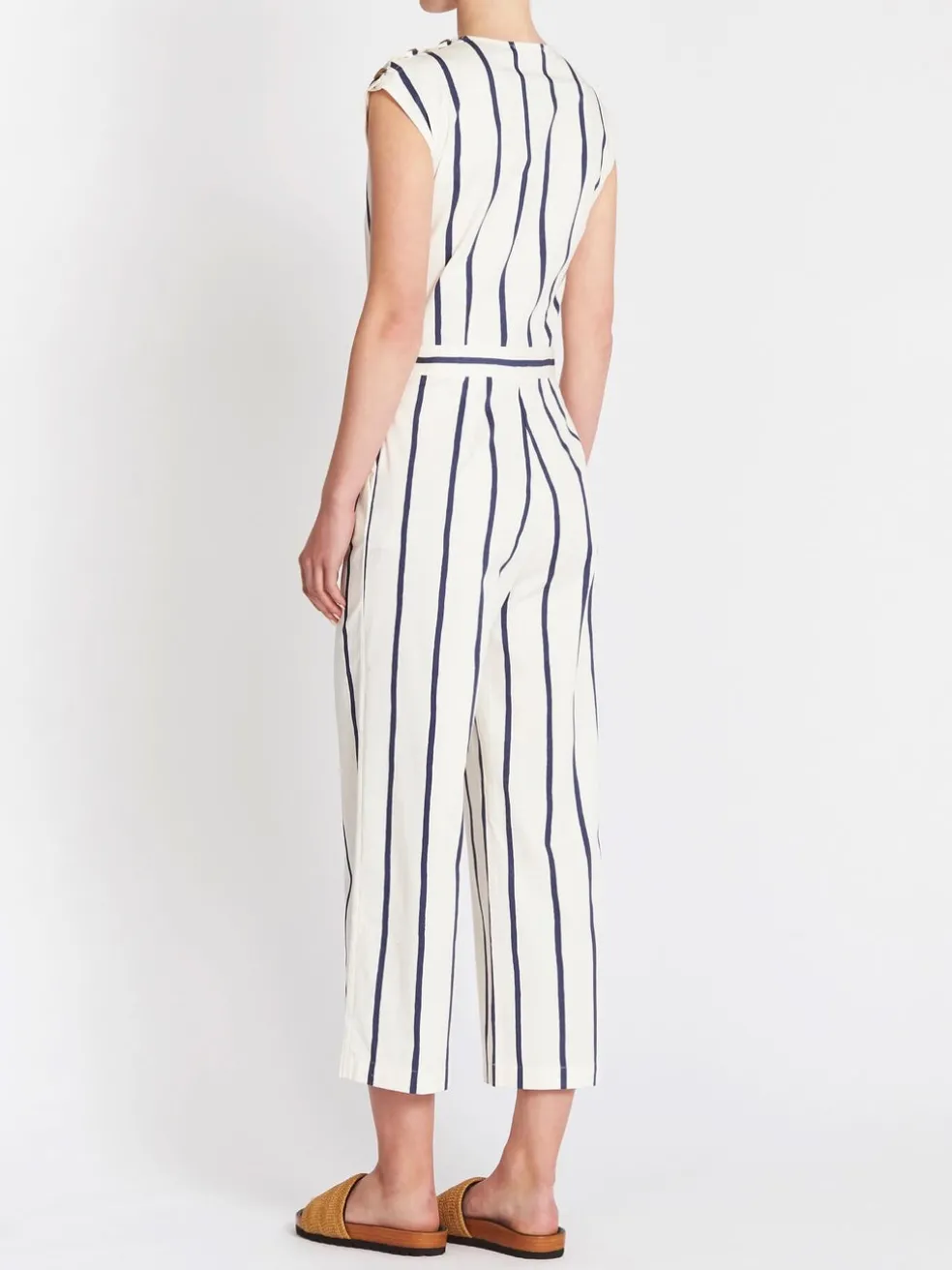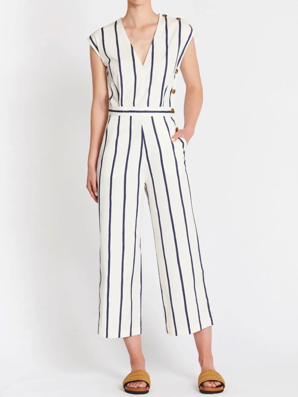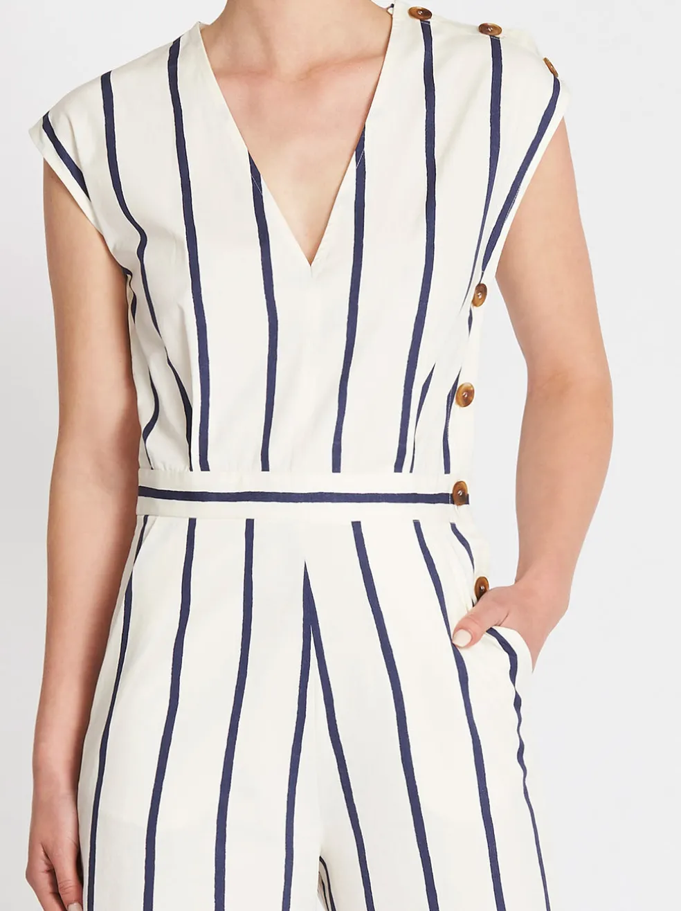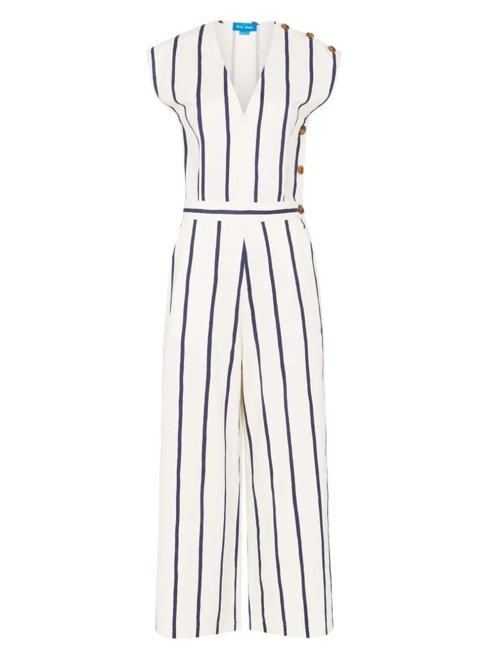 A sophisticated style, the M.I.H Jeans Elm All In One Jumpsuit in Dark Blue Stripe is lightweight cotton design. An easy tailored fit, it features shoulder and side button detail.