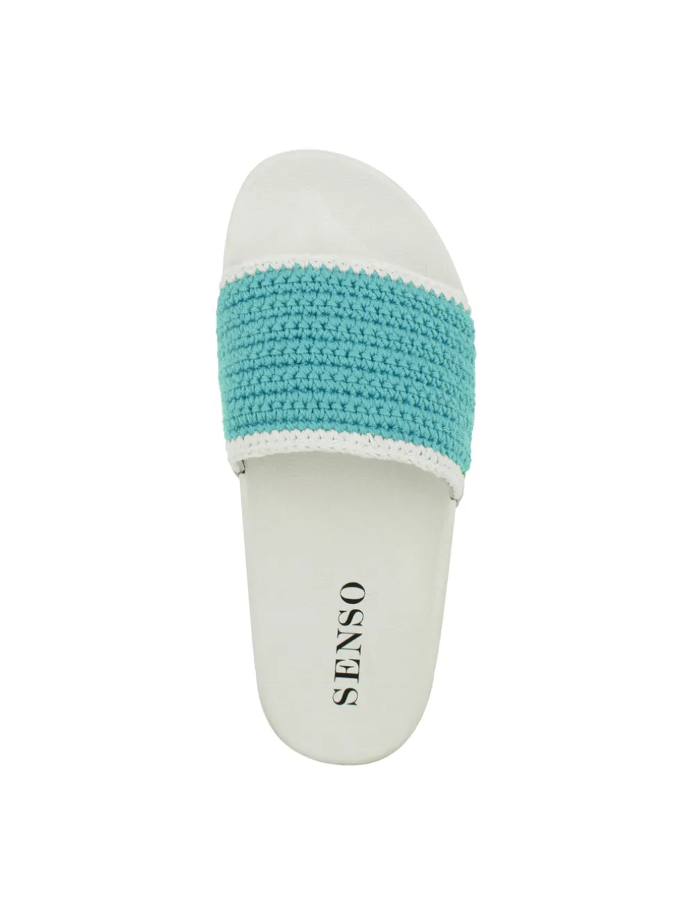 The Esme Slide from Senso is the perfect beach accessory. This white rubber sole will have you gliding over to the sand with ease and the crochet Aqua band is reminiscent of the clean sparkling waves.