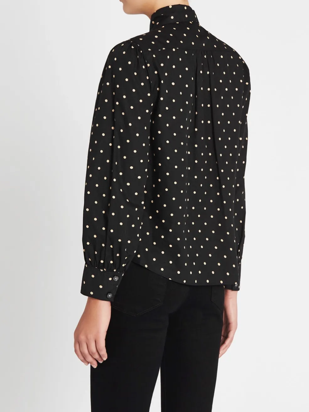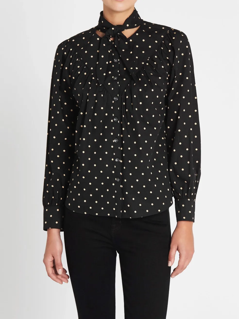 Add some Parisian vibes to your wardrobe with the Rebecca Taylor La Vie Estelle Dot Scarf Neck Top. Constructed from 100% cotton this long sleeve top features a centre front button opening, long sleeves with gathered detailing at the cuff, gathered detailing through the bust and is finished with a self tie scarf at the neckline.