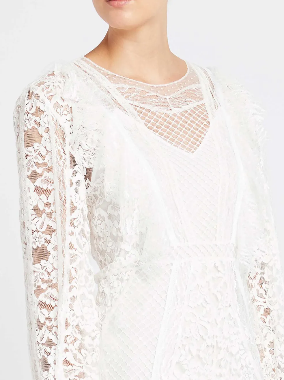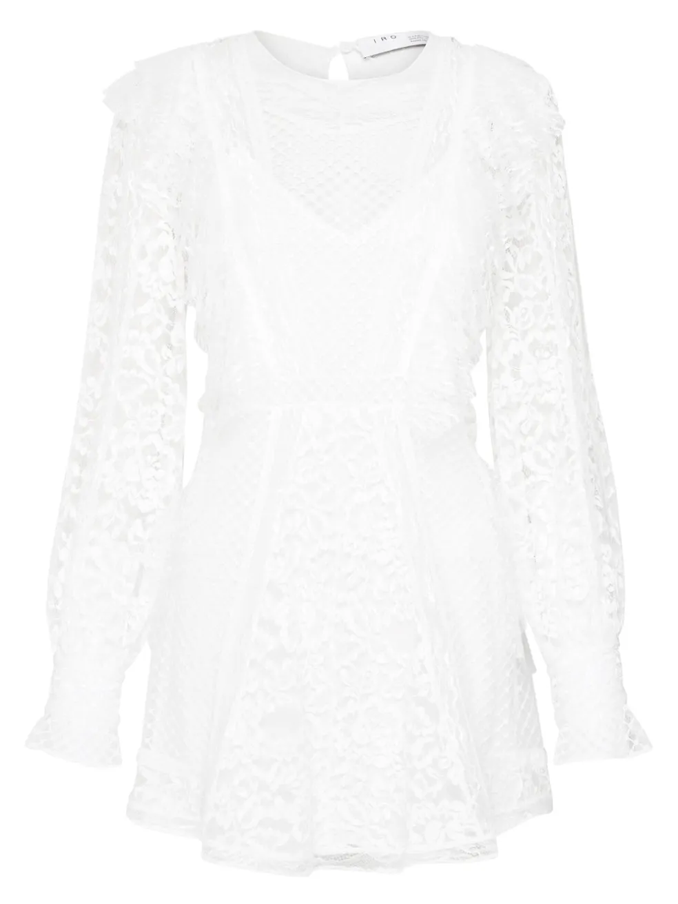 The IRO Fergus Dress in White is the ultimate white dress to add to any wardrobe. Constructed in 3 delicate lace blends, this long sleeved mini dress features soft ruffle shoulder to bodice detailing and is distinguished by its contrast lace panelling with an accompanying undergarment slip. Pair with a leather jacket and heels for a killer European-style muse.