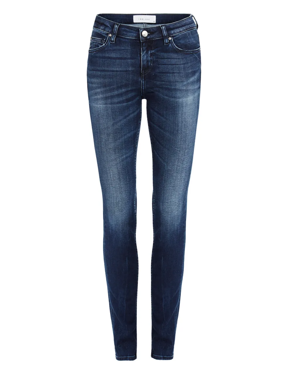 The Flesk Jean from IRO Jeans are a super soft faded wash denim, with a skinny leg cut and a low rise of 8.5 inches. With their whiskering along the hips, inner thighs and on the left calf, and with their silver hardware, these jeans are full of detail.