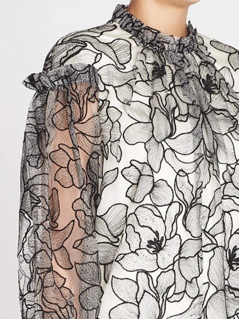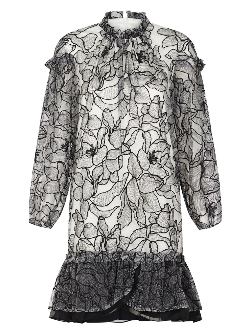The Floral Factor Dress from Three Floor is a retro inspired shift dress with a sheer sleeve detail. Constructed from a sheer organza covered with black floral embroidery design the dress has a high Elizabethan collar, frill cuffed sleeves and a frill trimmed hemline. Invisible back zip closure.