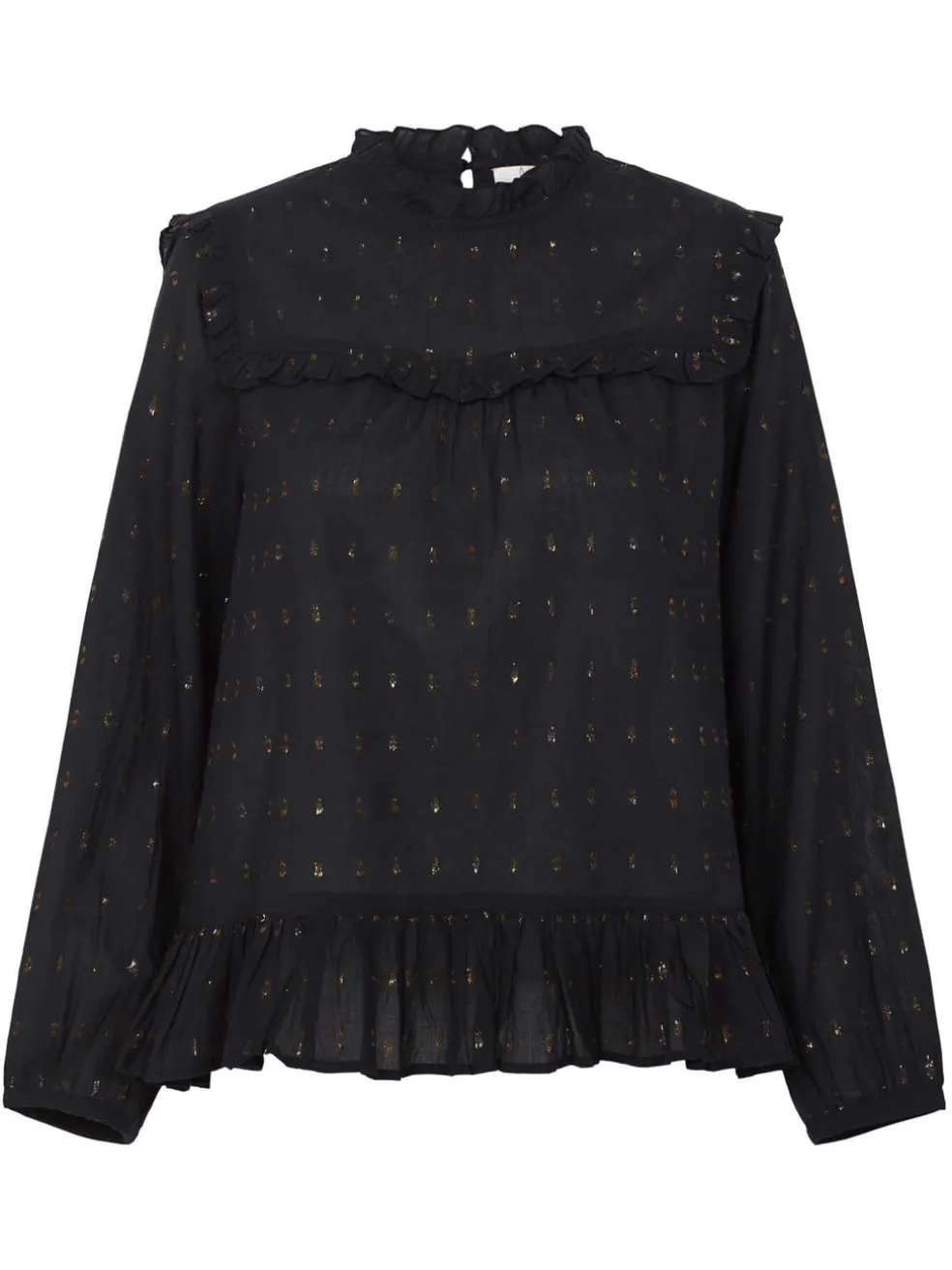 Add a touch of metallic glam to your look with the Joie Gianella Blouse in Caviar. Constructed from a cotton blend fabric this top features bracelet length sleeves, a ruffled hem and a high neckline that is finished with a ruffled trim and centre back closure. Dotted metallic detailing adds some spark to this piece, making it the perfect ultra comfortable piece that can go from day to night with ease.
