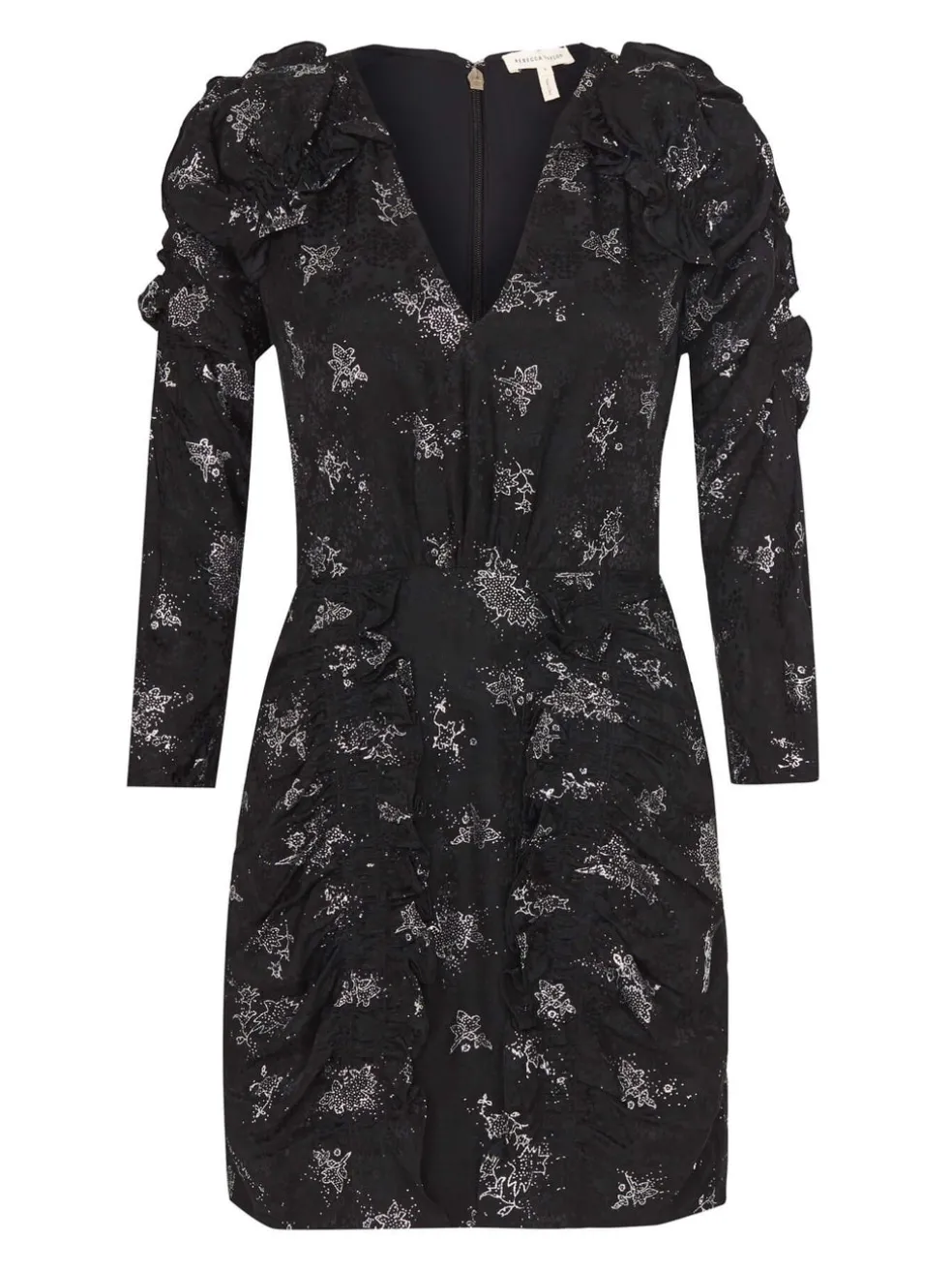 The Little Black dress is re-worked and glammed up to create the Rebecca Taylor Glitter Print Silk Jacquard Dress. Constructed from a floral silk jacquard flecked with glitter printed botanicals this dress features 3/4 length sleeves with shirred details, subtle gathering through the waistline, ruffled trims and is finished with a v neckline. Wear yours with strappy black heels for the perfect evening attire thats as playful as it is classic.