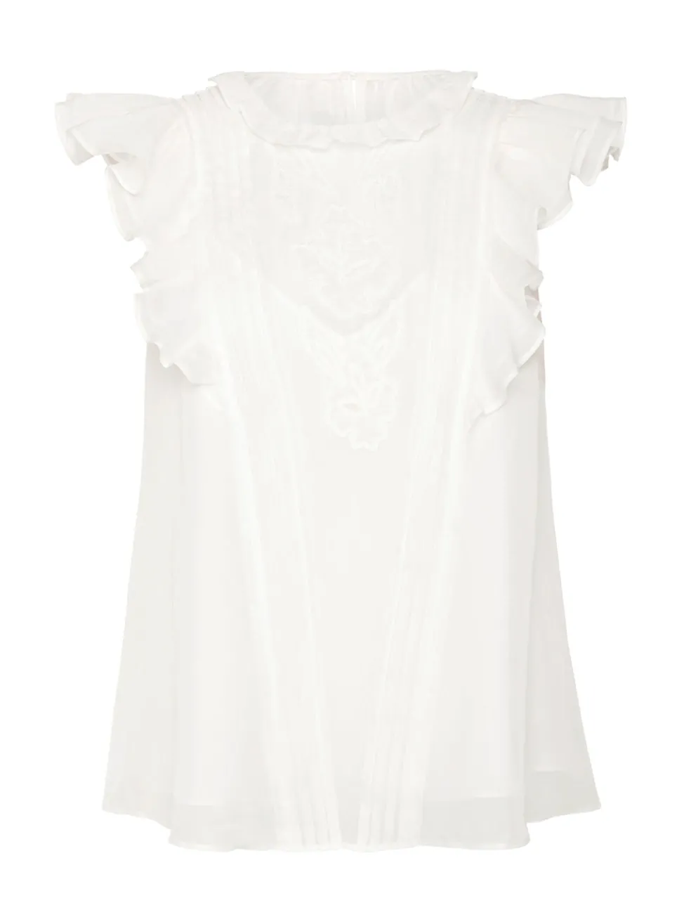 Rebecca Taylor delivers the perfect summer top with the Hana Applique Embroidered Top in Snow. Crafted from a lightweight chiffon this sleeveless blouse features a high neckline adorned by airy ruffles flowing down the front and back sleeves and is framed by delicate pintucks, embroidered floral appliques, finished with delicate corded edges. Pairs beautifully with a denim mini skirt.
