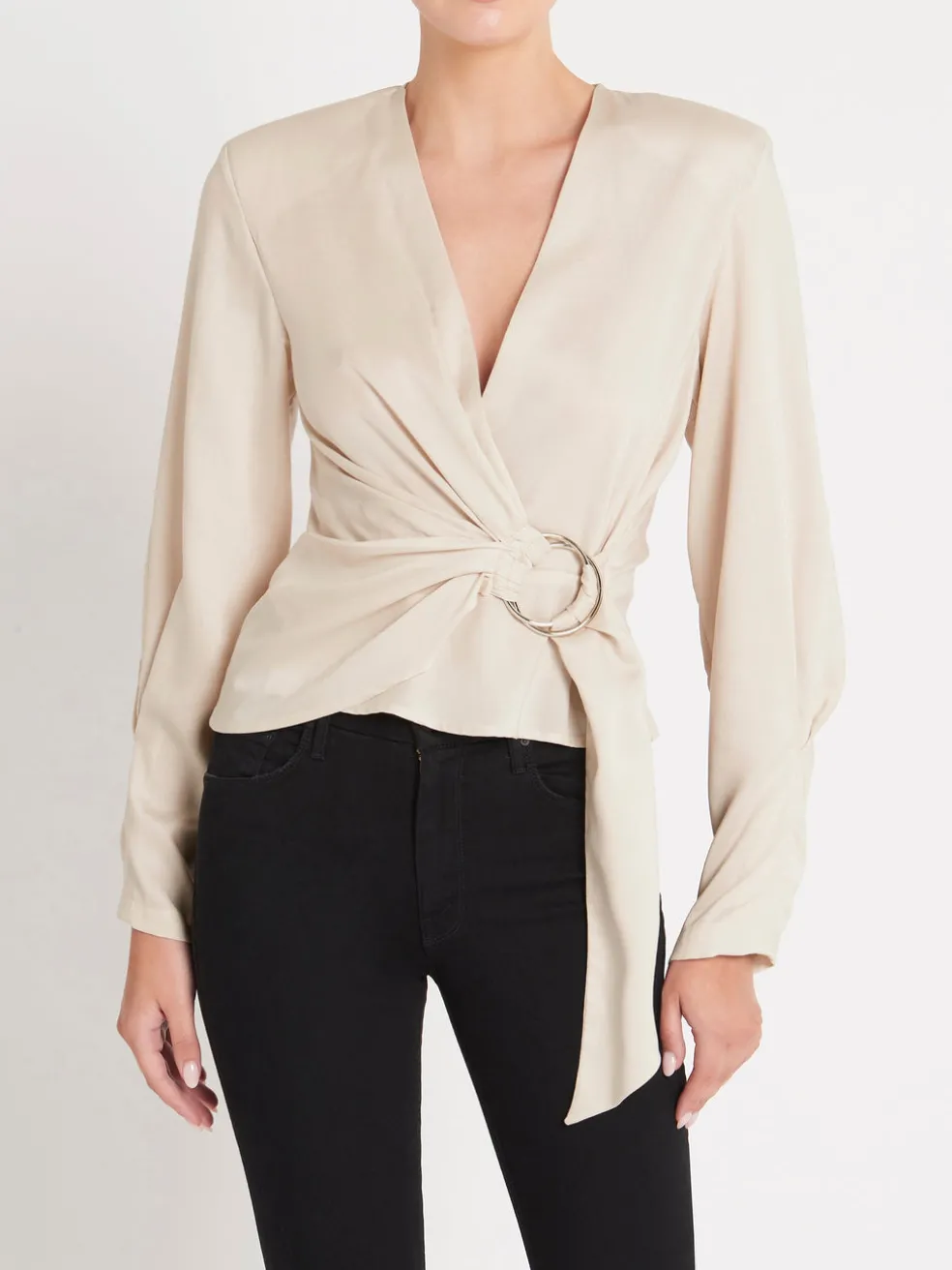 The IRO Hazal Top in Ecru flatters any figure with a wrap style waist ending in a silver ring closure. Shoulder pads add a dramatic boost to this otherwise simple style. Wear it with loose pants or straight cut jeans.