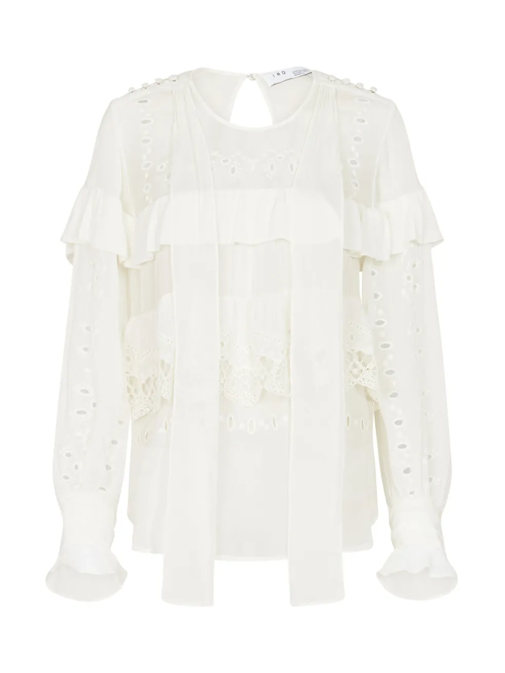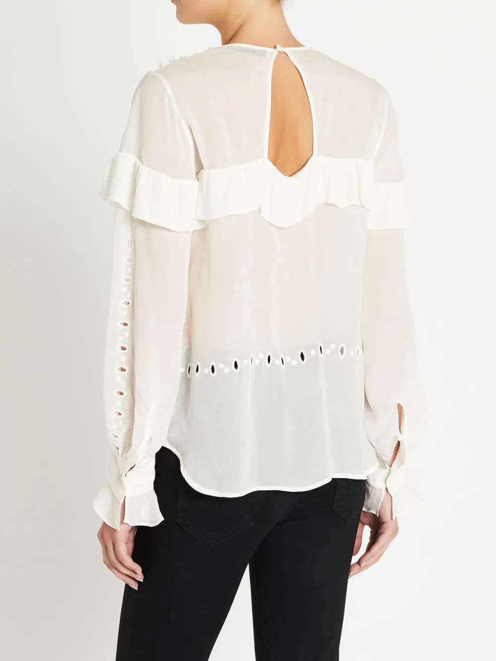 The slightly sheer fabric of the top adds a playful touch to the design, while the ruffled trim along the hem and the self-belted neckline adds a feminine and stylish touch to the top. The curved hem of the top adds a flattering silhouette to the overall design, making it perfect for pairing with high-waisted trousers or skirts.