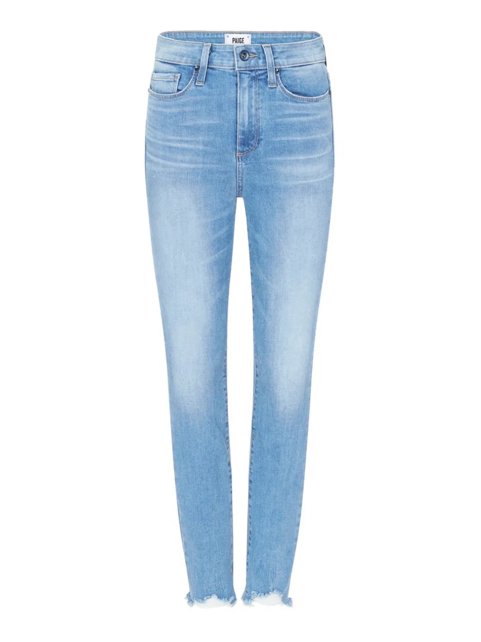 The Paige Hoxton Ankle Crop Jean in Alameda are the perfect classic skinny jean to add to your denim collection. Constructed from a stretchy cotton blend these mid blue mid rise jeans feature shiny black hardware, a single button zip fly closure, whiskering along the waist, subtle fading through the leg and distressed cuff detail.