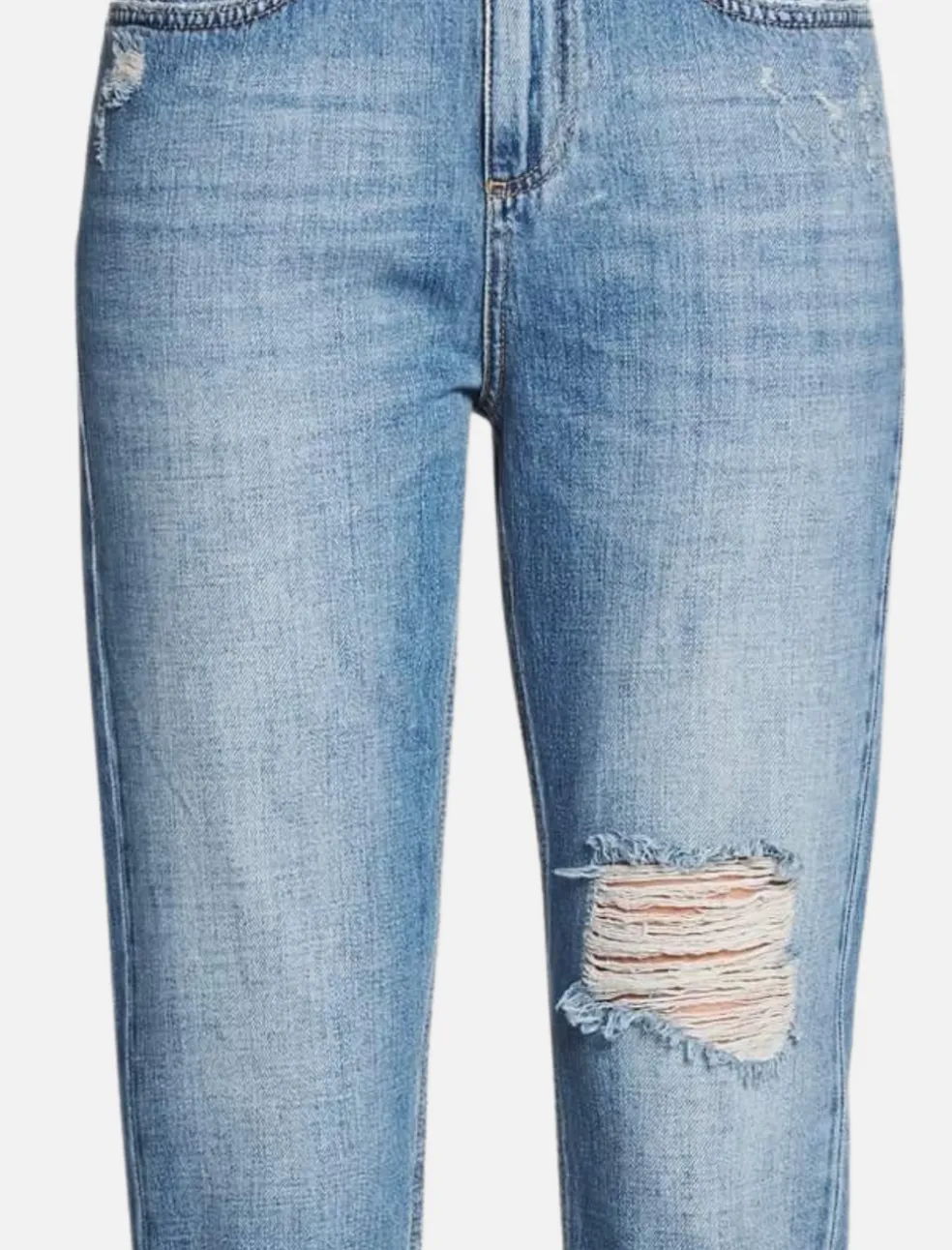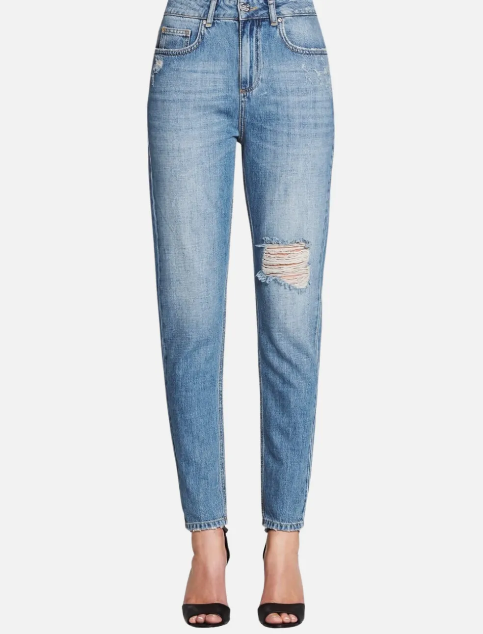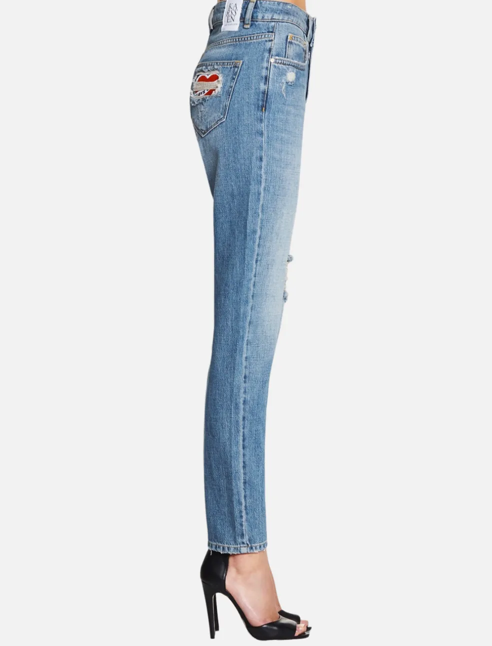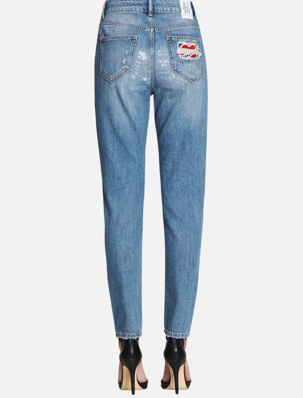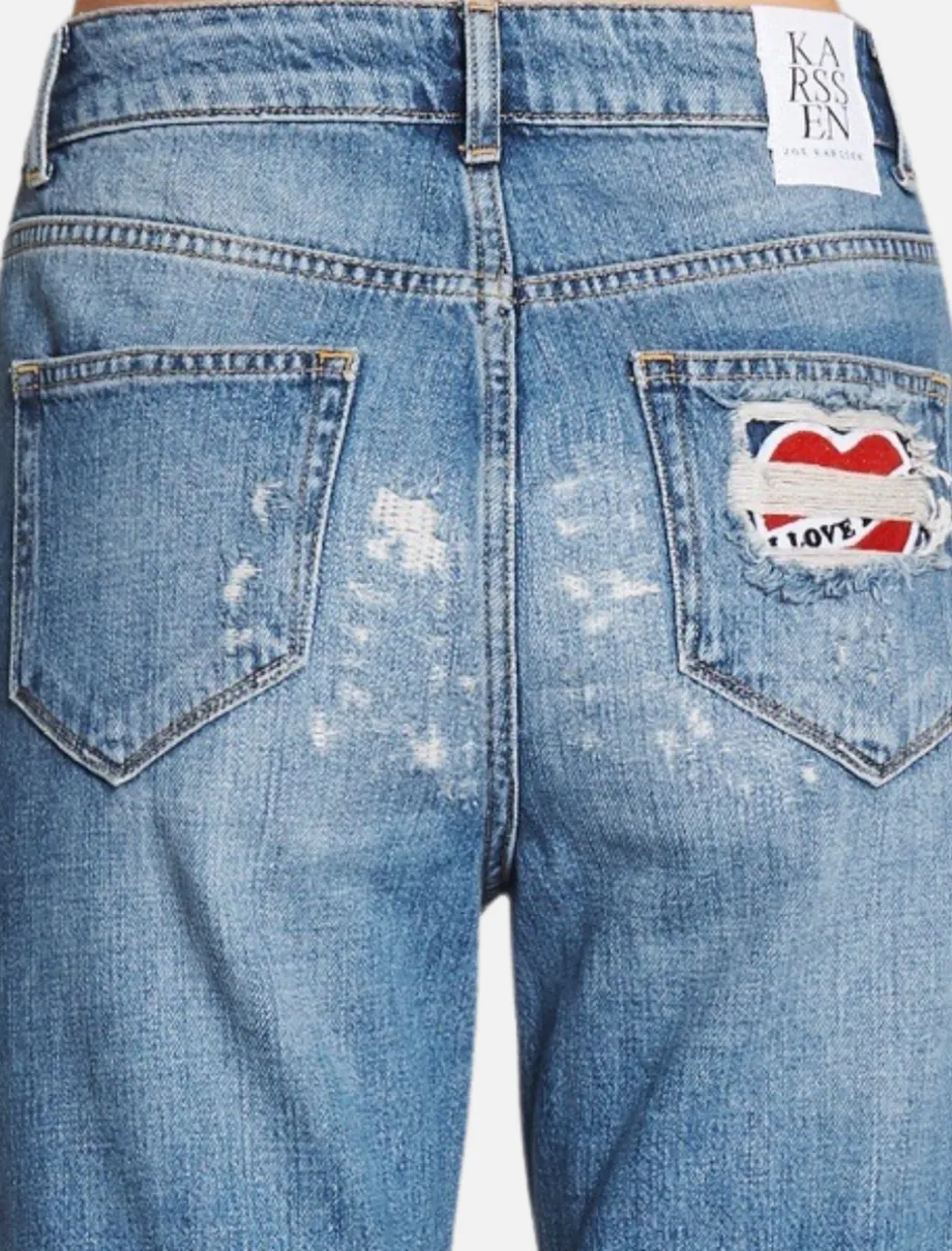 A Zoe Karssen favourite, the Janis Boyfriend Jeans are a loose fitting style with a slightly tapered leg. Here they have been constructed in a light blue denim wash with a ripped knee detail. This particular style features an embroidered design that playfully says “I Love Bikers” under a ripped back pocket.