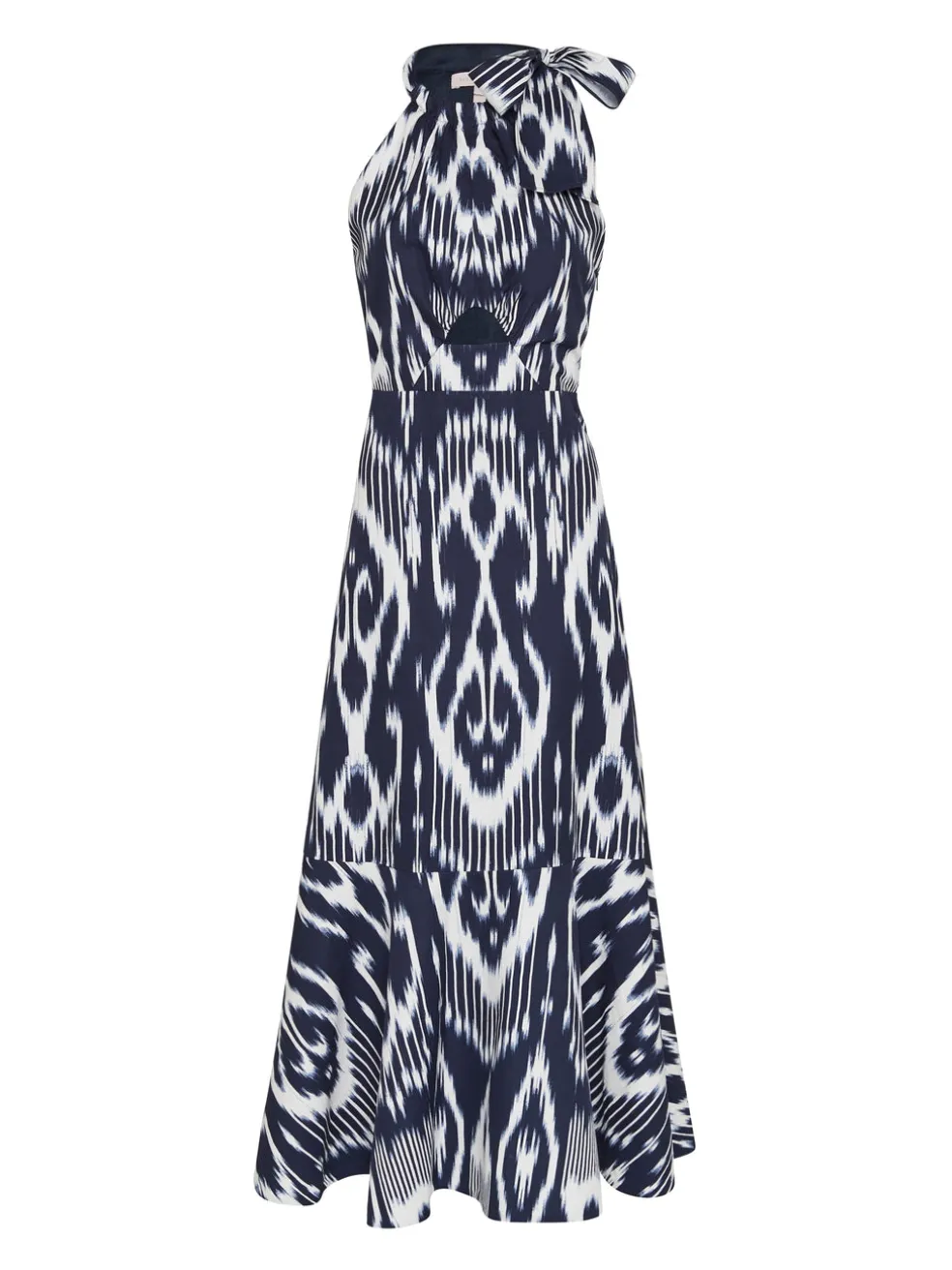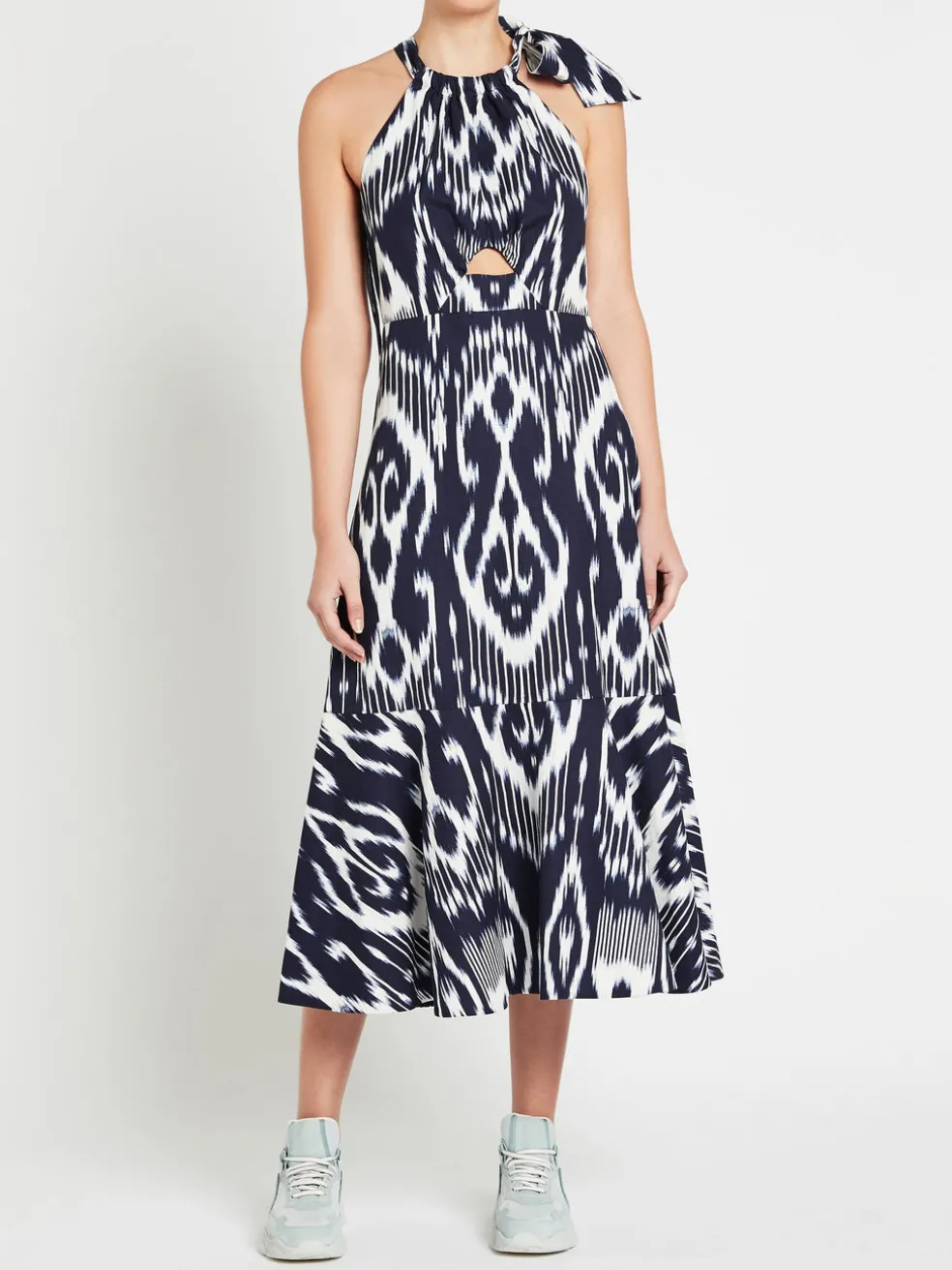 Radiate this season in the Ikat Linen Dress in Indigo Combo by Rebecca Taylor. Constructed from a soft cotton-linen blend, this sleeveless midi dress features a bold ikat graphic design in contrasting indigo and white and is finished with a sculpted flounce on the skirt and accompanied with a waist tie belt to cinch in the waist. Pairs beautifully with a summer slide or take it to a vacation adventure level with a white sneaker.