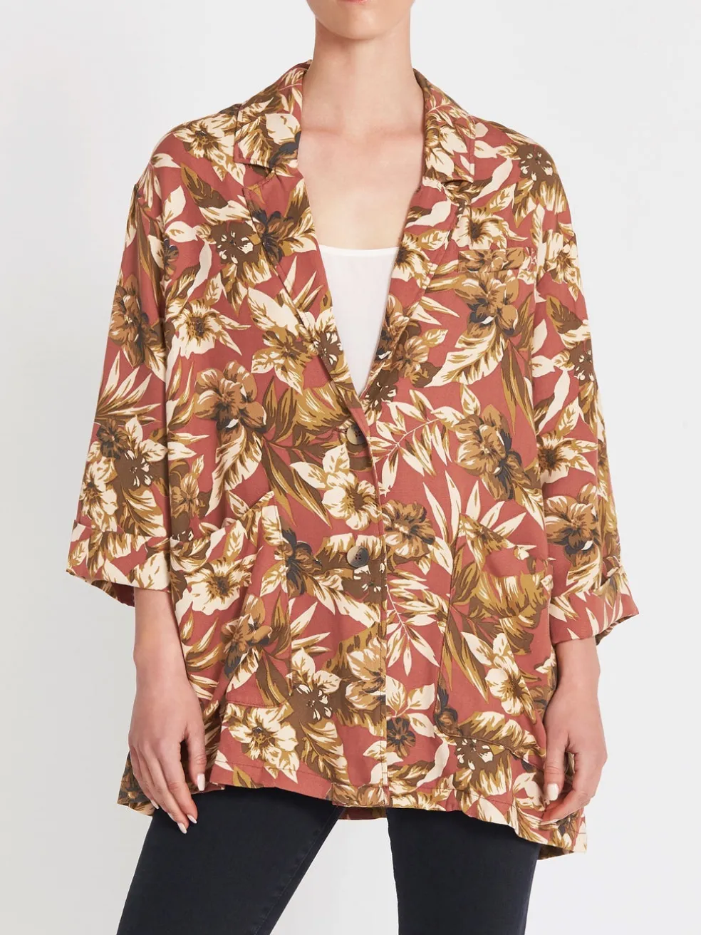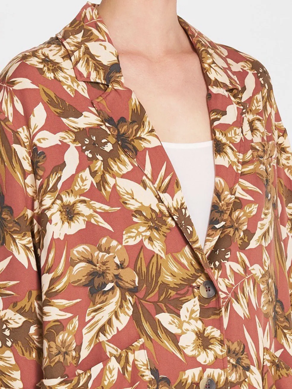 A long sleeved, mid length printed piece from American Vintage, the Janebay Jacket in Hawaii features front button closure, dual front pockets and an earthy toned floral pattern.
