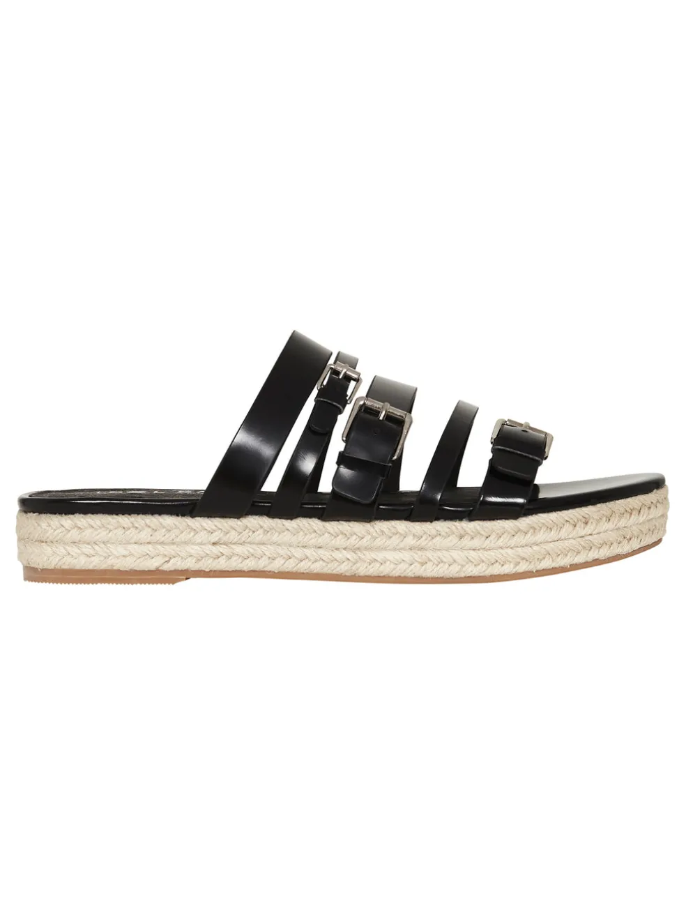 Take your summer style to the next level with the Sol Sana Joan Espadrille in Gloss Black. These are an easy to wear, open toe slip on featuring buckle straps and straw toned jute on the 2cm platform.