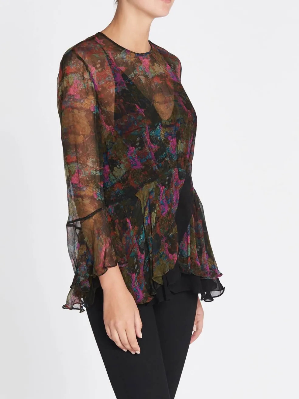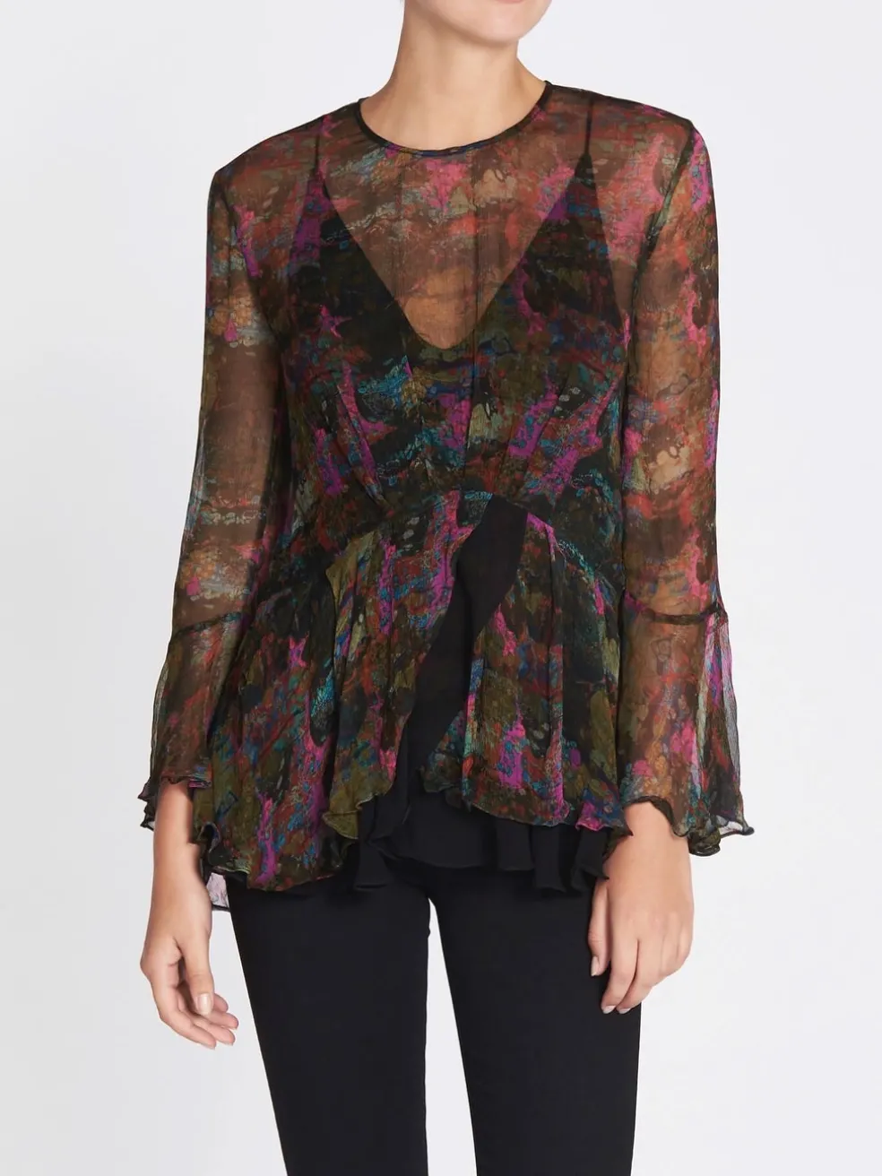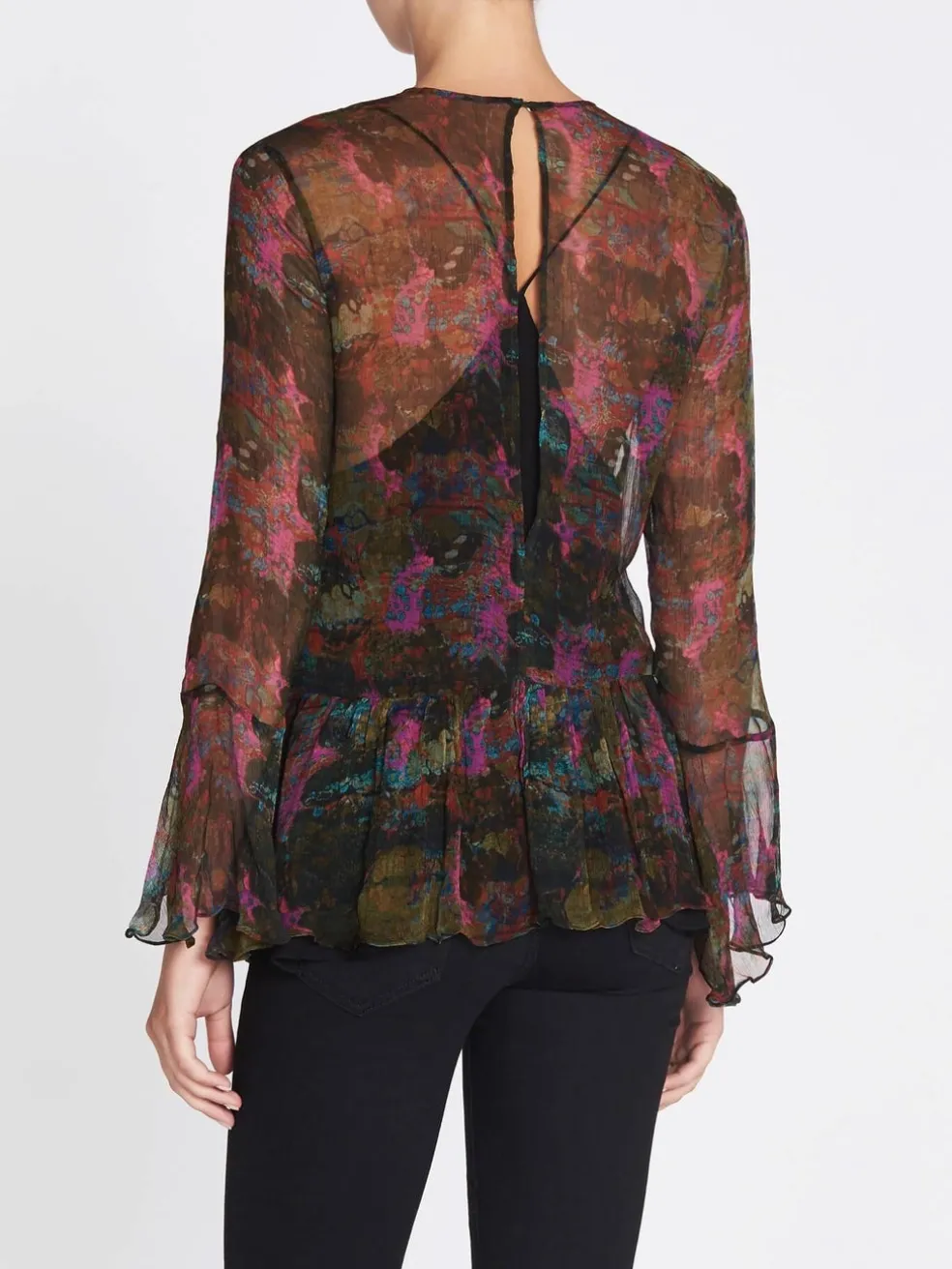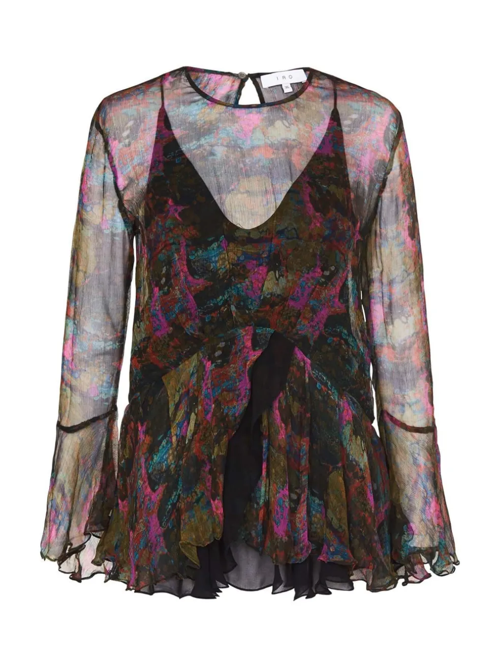 Add a subtle hint of colour to your wardrobe the the IRO Jorie Top in Multico Pink. Constructed from a lightweight viscose this slip over piece features a jewel neckline, long-sleeves, ruffled hem and is lined through the bodice. Wear yours with jeans for elevated weekend style or team with a little black skirt and heels for an evening look.