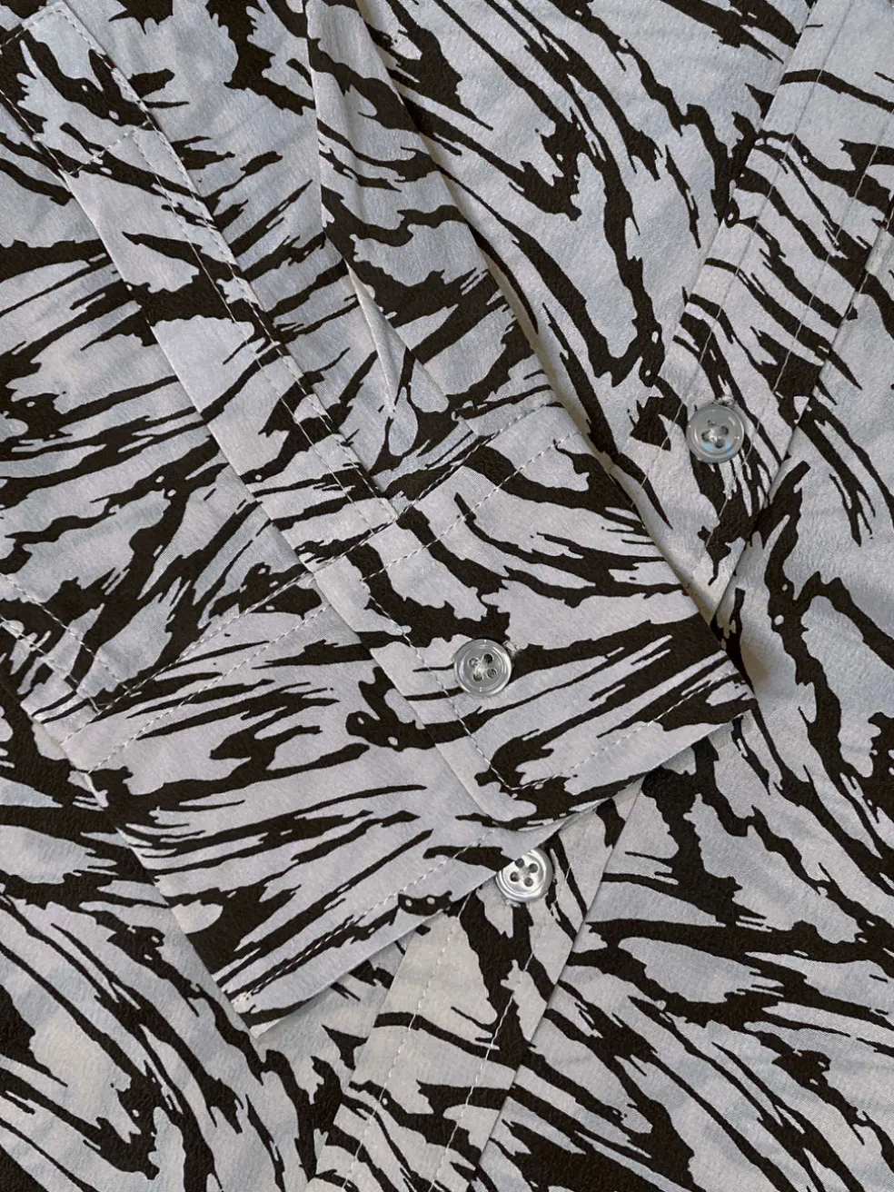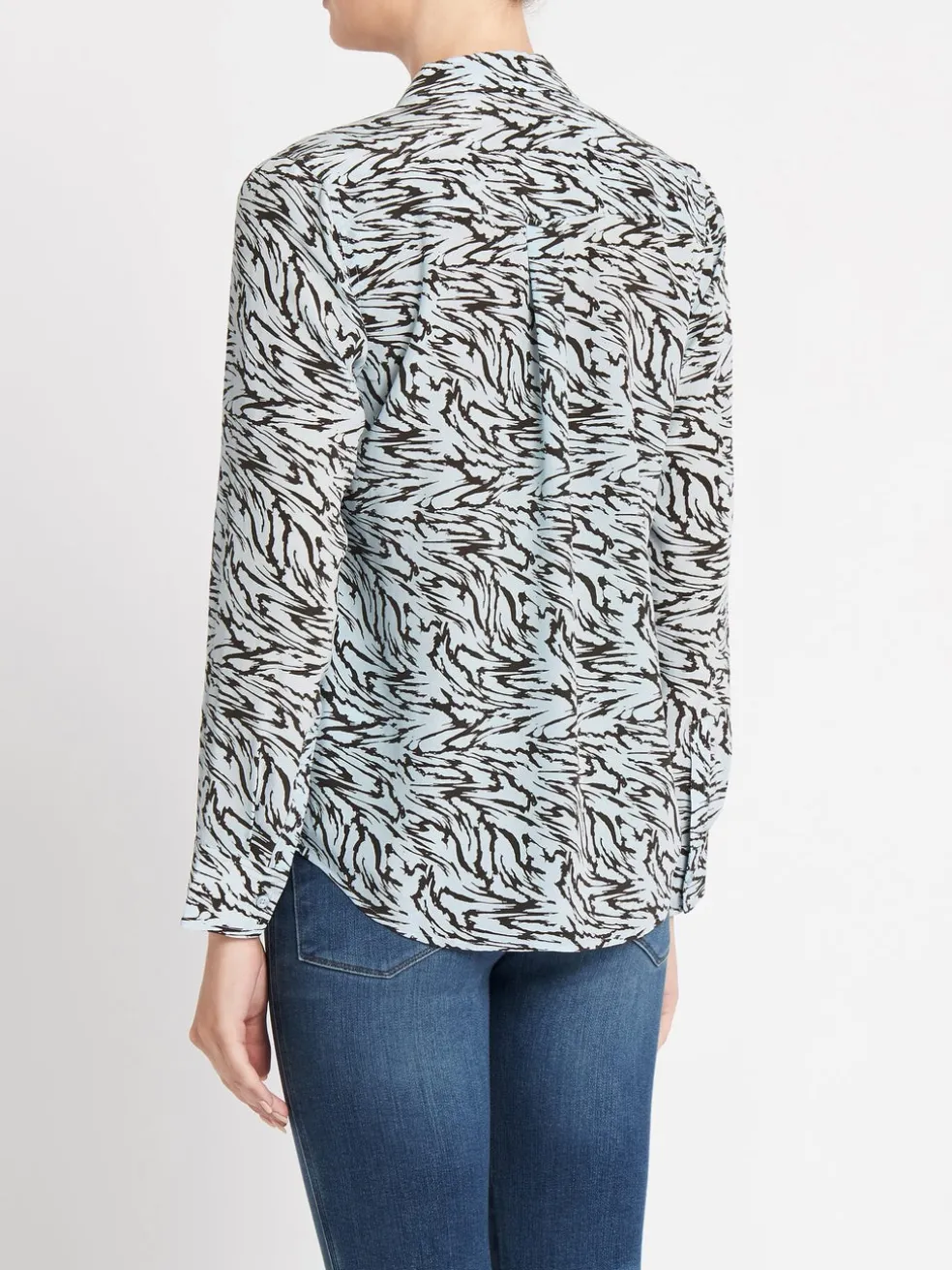 Sophisticated and fun, this shirt will wear itself to work, dinner or drinks. The Kate Shirt in Powder Blue Marbled Tiger features black marbled tiger print throughout, tailored fit, and patch pocket at chest and 100% silk composition for a luxurious feel.