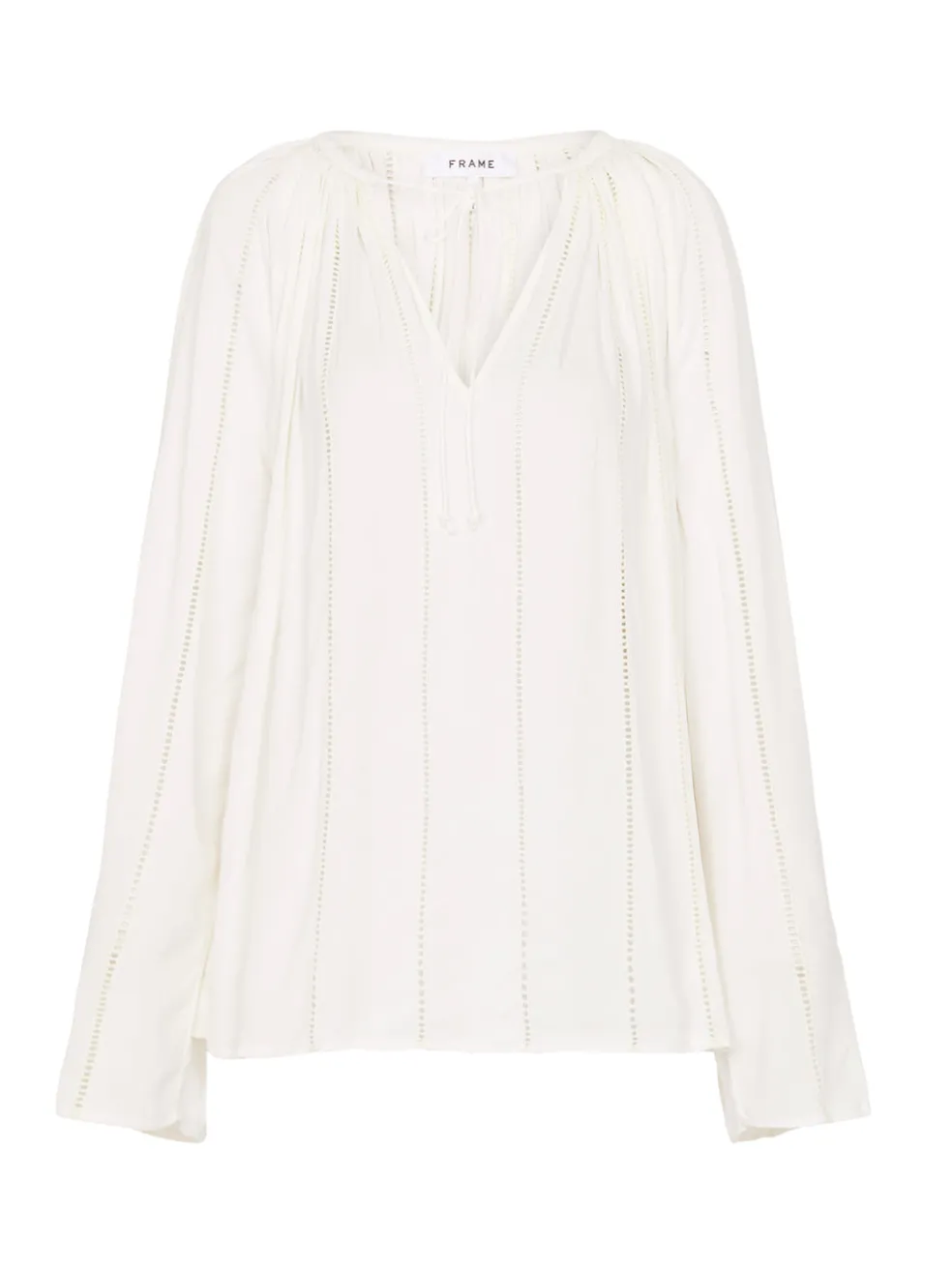Easy and breezy, the Frame Denim Lattice Peasant Top in Off White is the perfect addition to any wardrobe. Constructed from a lightweight viscose this flowy top features a rounded neckline with a self tie gathered finish, a wide set raglan sleeve and perforated lattice detailing.