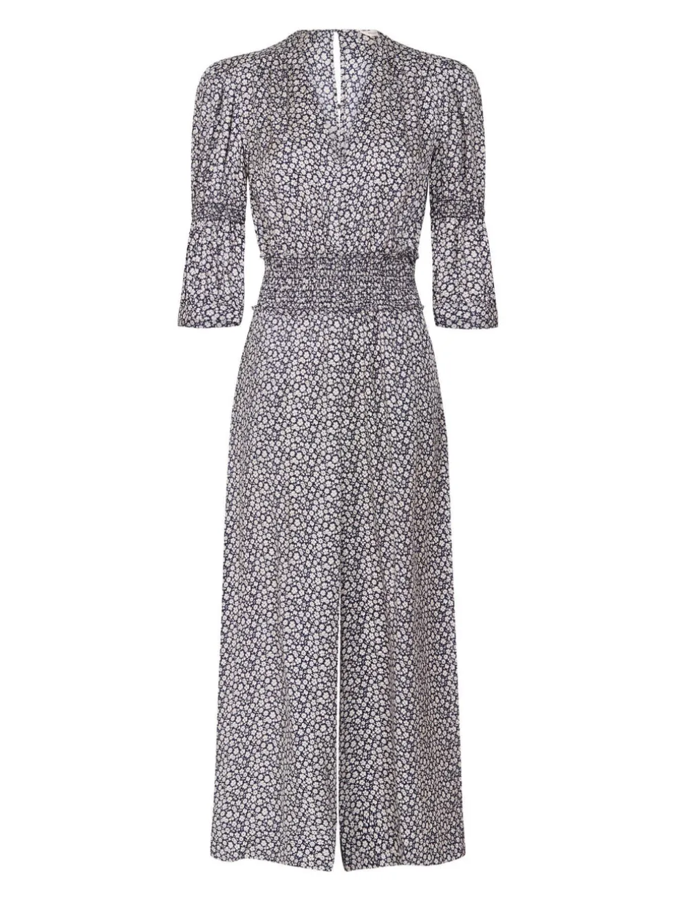 The Long Sleeve Lauren Floral Jumpsuit in Blueberry Combo is an effortless silk outfit with a sleek silhouette and softly sculpted sleeves. Finished with a wide legged cropped pant.