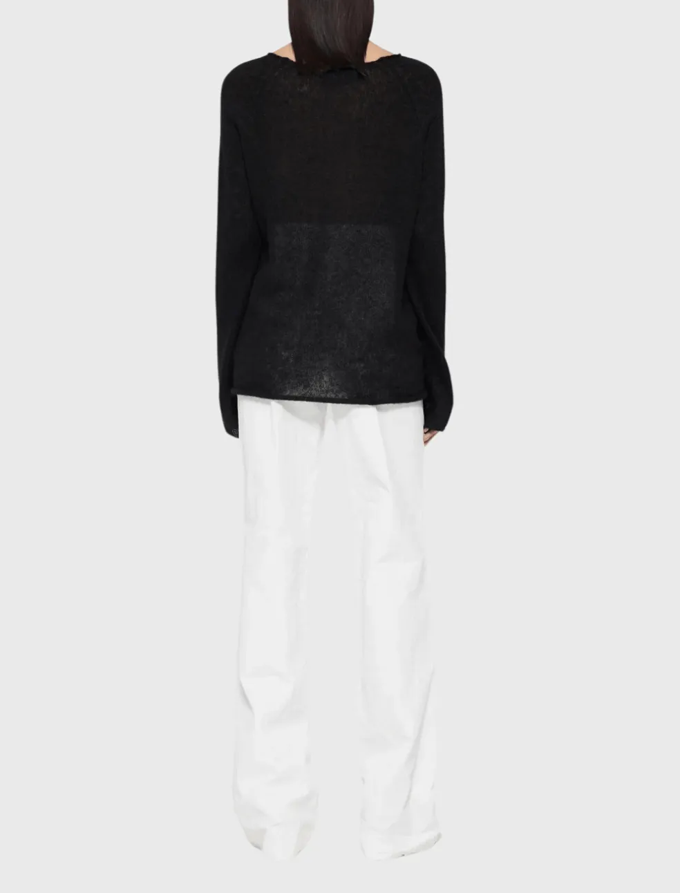 The RÓHE Layering Open Knitted Top in Noir—a sheer delight designed for those who embrace the art of layering. Meticulously crafted from a luxurious mohair and alpaca wool blend, sourced from the finest Italian mills, this top elevates your style game. The semi-sheer finish adds a touch of allure, making it perfect for transitioning from day to night.
