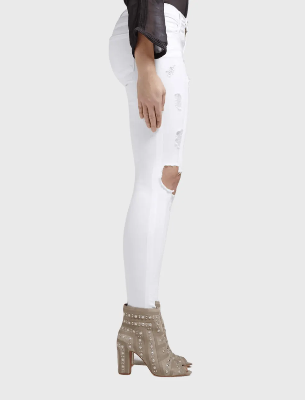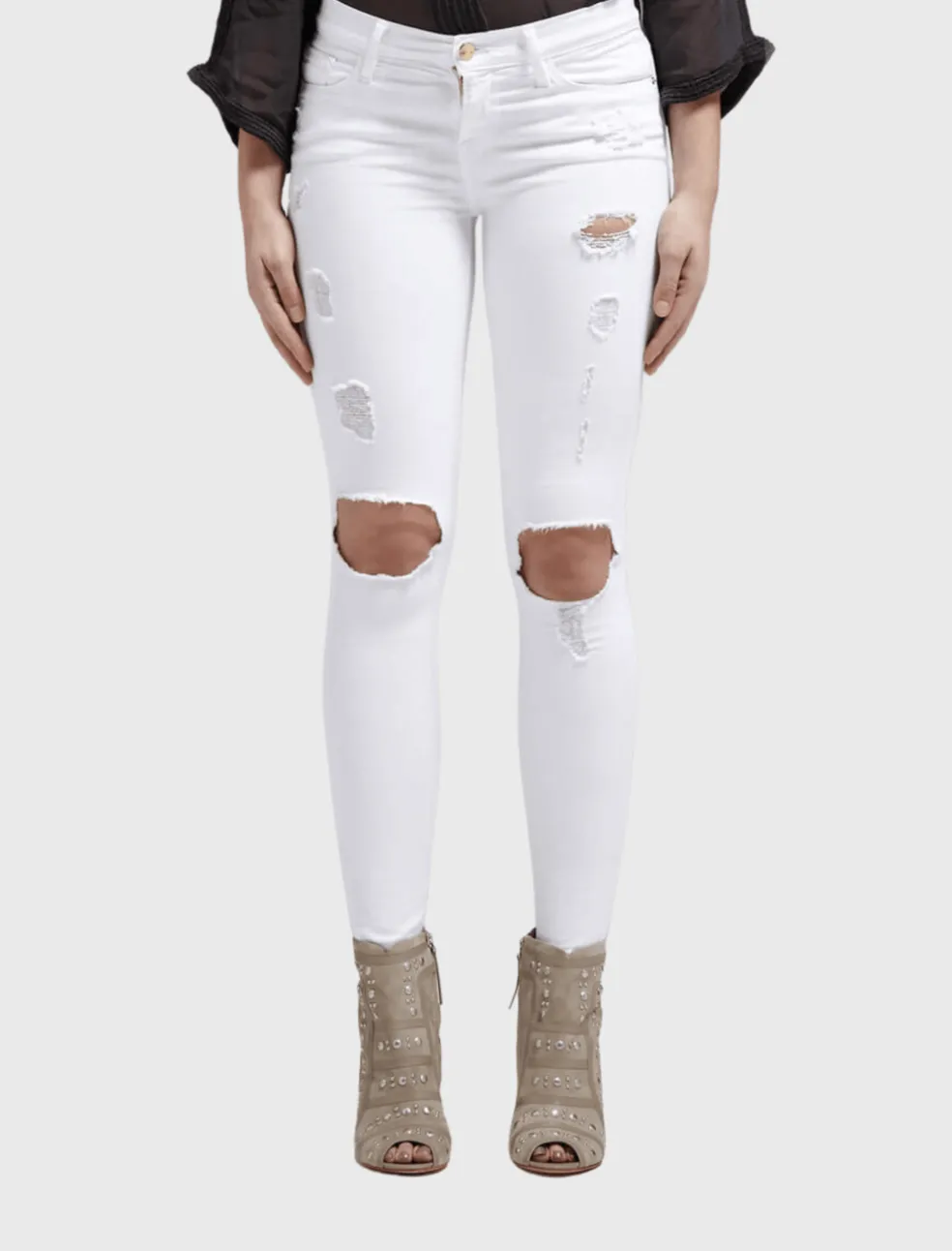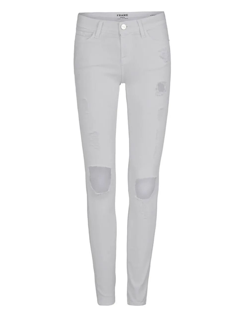These white Le Colour Destroy Jean by Frame Denim are a skinny leg pant with a low rise 8 inches. They are embellished with gold hardware and feature rips on the knees, and are slightly destroyed along the thighs.