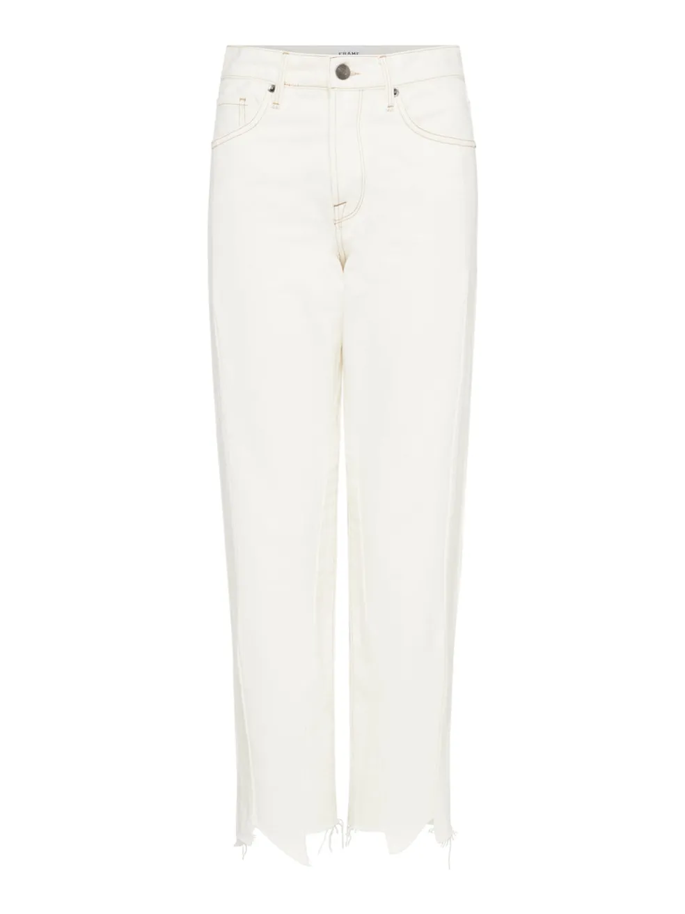 Give your denim style an edgy update with the Frame Le Original Jagged Edge Jean in Vintage White. Constructed from cotton blended with recycled polyester these jeans feature a high rise slim leg jeans feature a button fly, 5 pockets, contrast stitching as is finished with a super cool distressed detailing along the jagged ankle length hem.