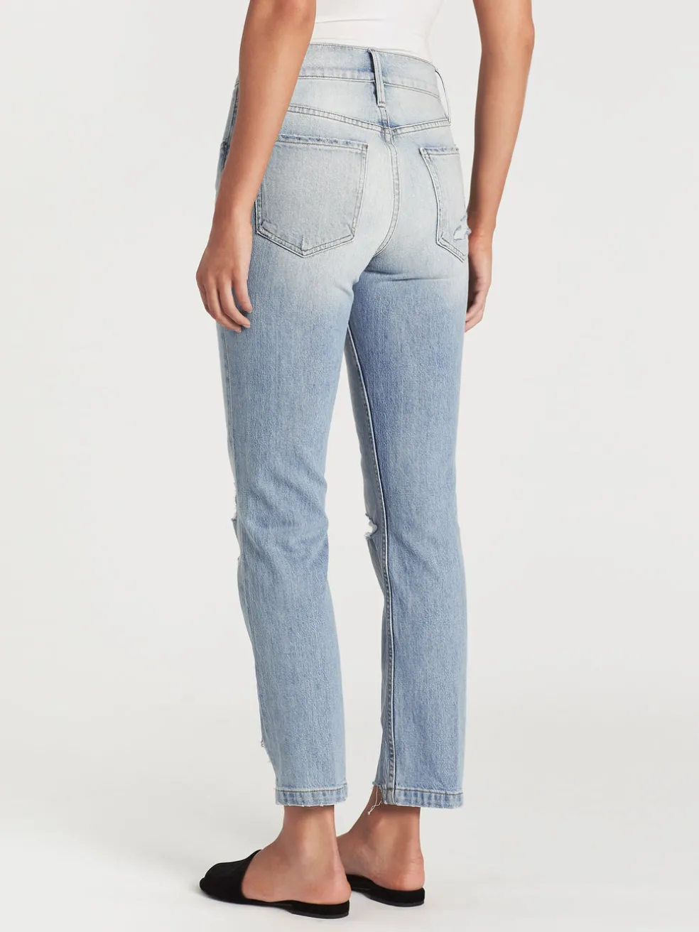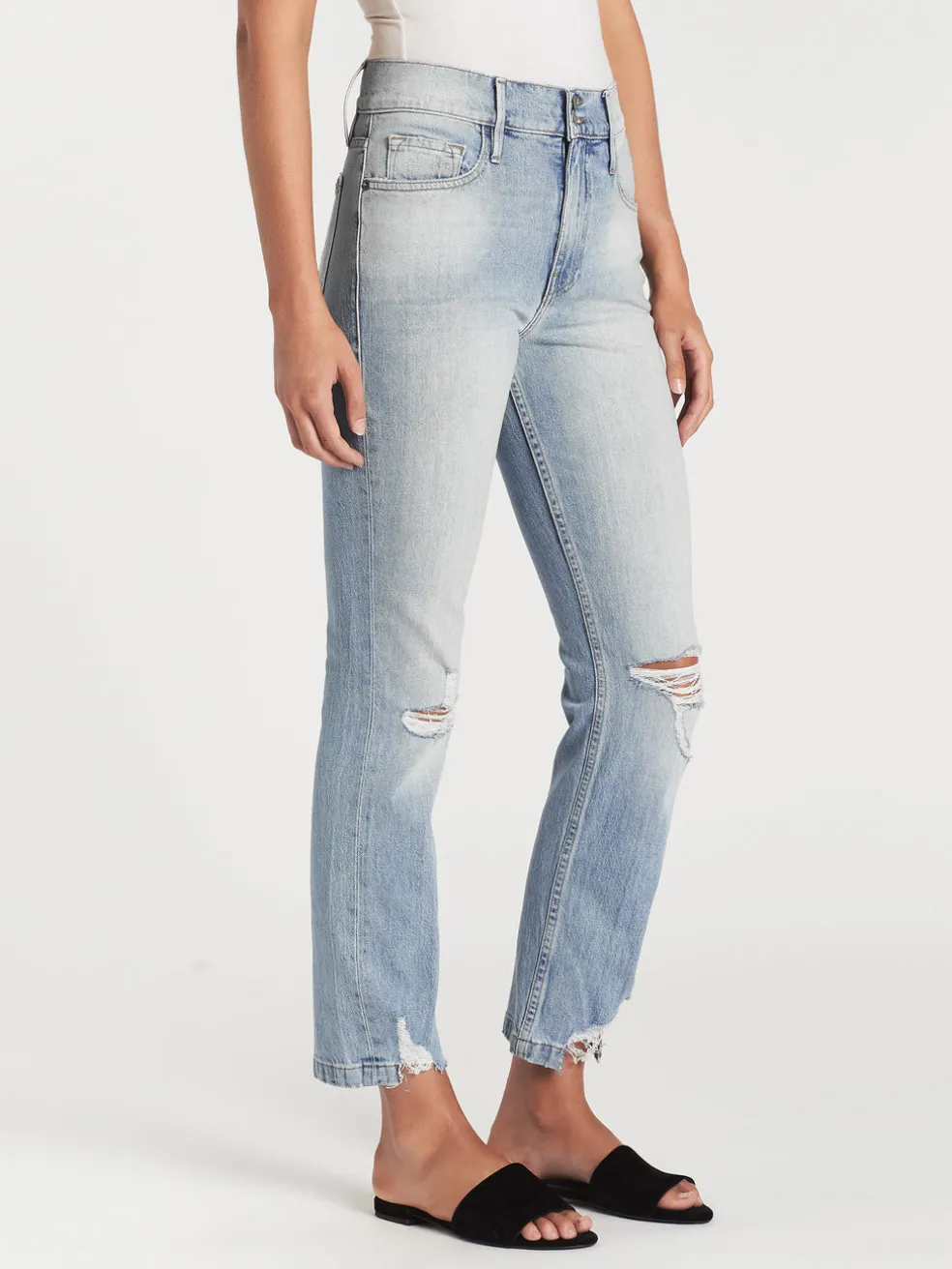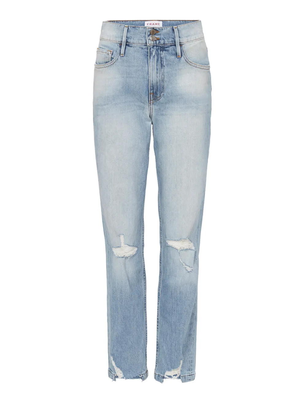 For the perfect vintage inspired jeans look no further than the Frame Le Sylvie Slender Straight Heritage in Springsteen. Constructed from a cotton blend denim these easy to wear high rise jeans feature a wider waistband with a double button finish, front and back pockets, rips at the knees and are finished with distressed hems.