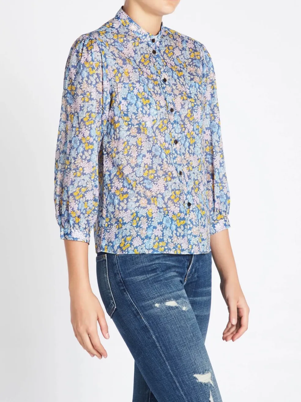The M.i.h Jeans Lilli Shirt in Treelove print is made from a delicate lightweight cotton voile printed with a charming mini floral in blue, pink and yellow. Featuring a 3/4 sleeve, button down front and a mandarin collar.