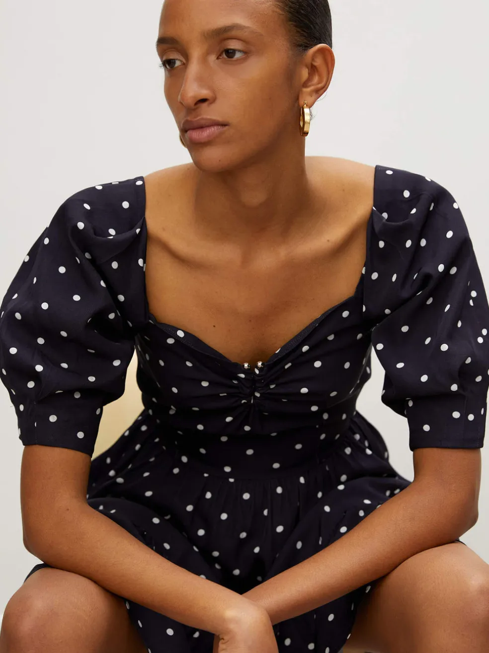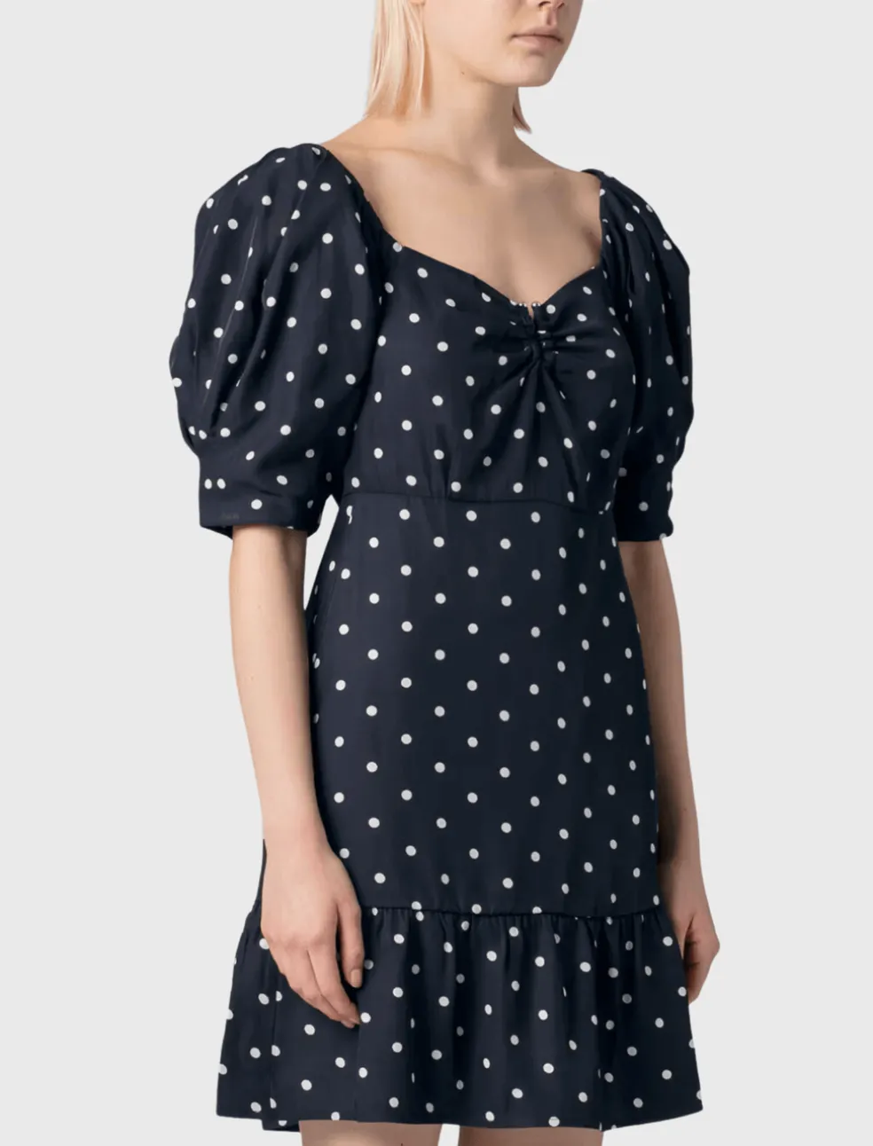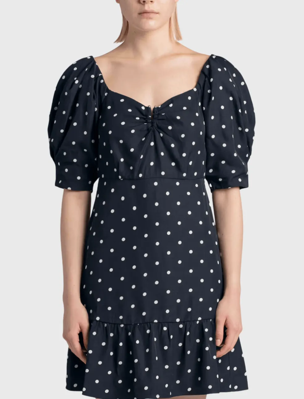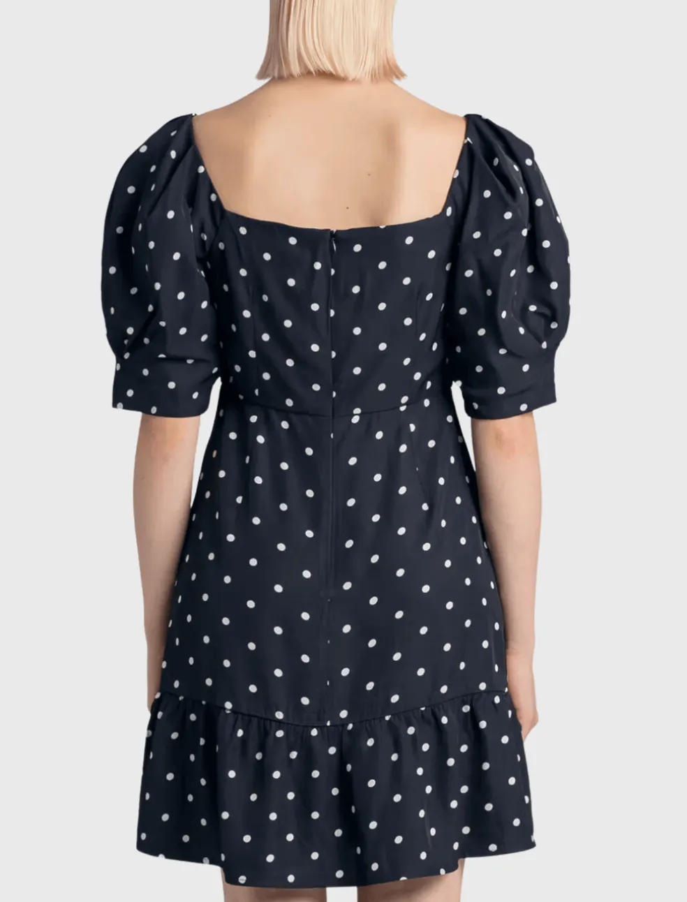 This adorable mini dress is a winning combination of fun and flirty. Featuring a balloon puff sleeve, sweetheart neckline and a fitted skirt with frill detail. This Róhe dress is made from a responsibly sourced viscose twill fabric with a white dot pattern. Features a back zip closure with a shining silver U ring detail at the central front neckline.