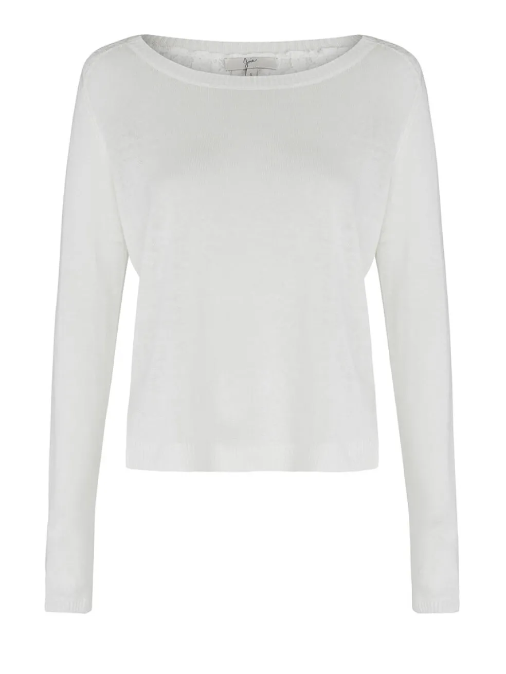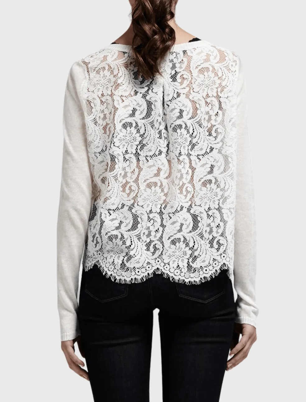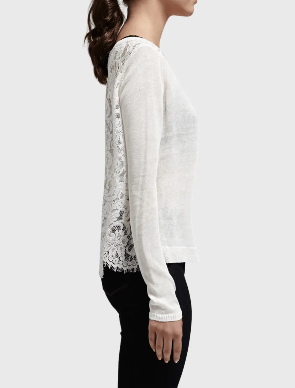 This lightweight knit by Joie features a beautiful white lace back, ribbed collar and cuff detailing. This scooped neck and long sleeved sheer knit has a split detail at the hem and can be worn with a bralette underneath or can be paired with a camisole.