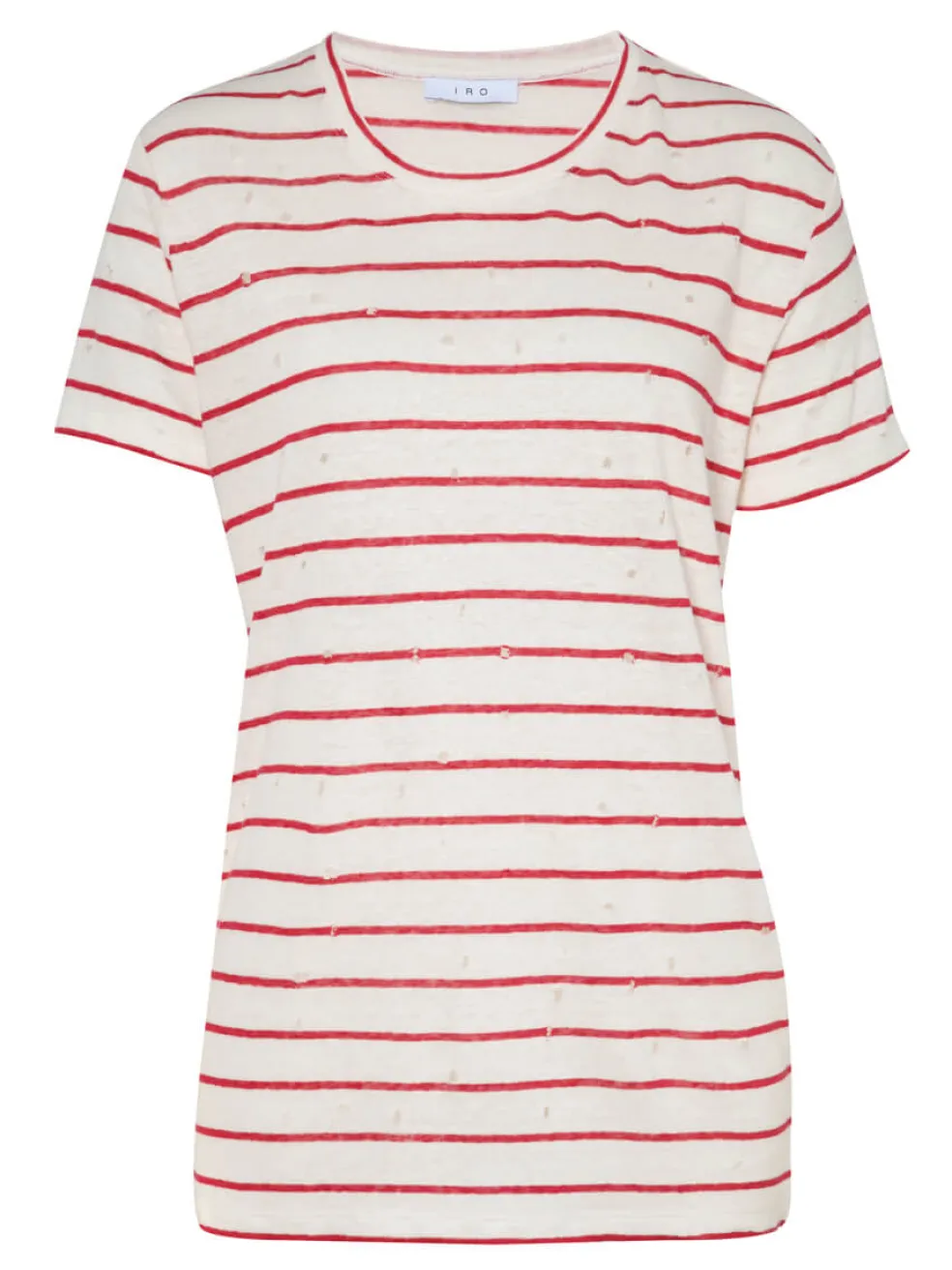 This vintage inspired linen tee is a great all rounder. The IRO Mina Tee is a classic crew neck tee with a thin red stripe detail it features shredded holes and a slight drop shoulder.