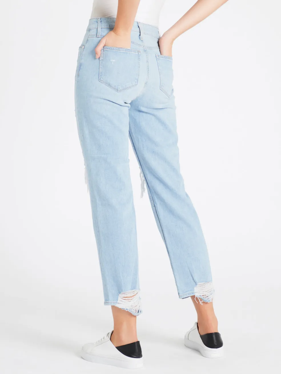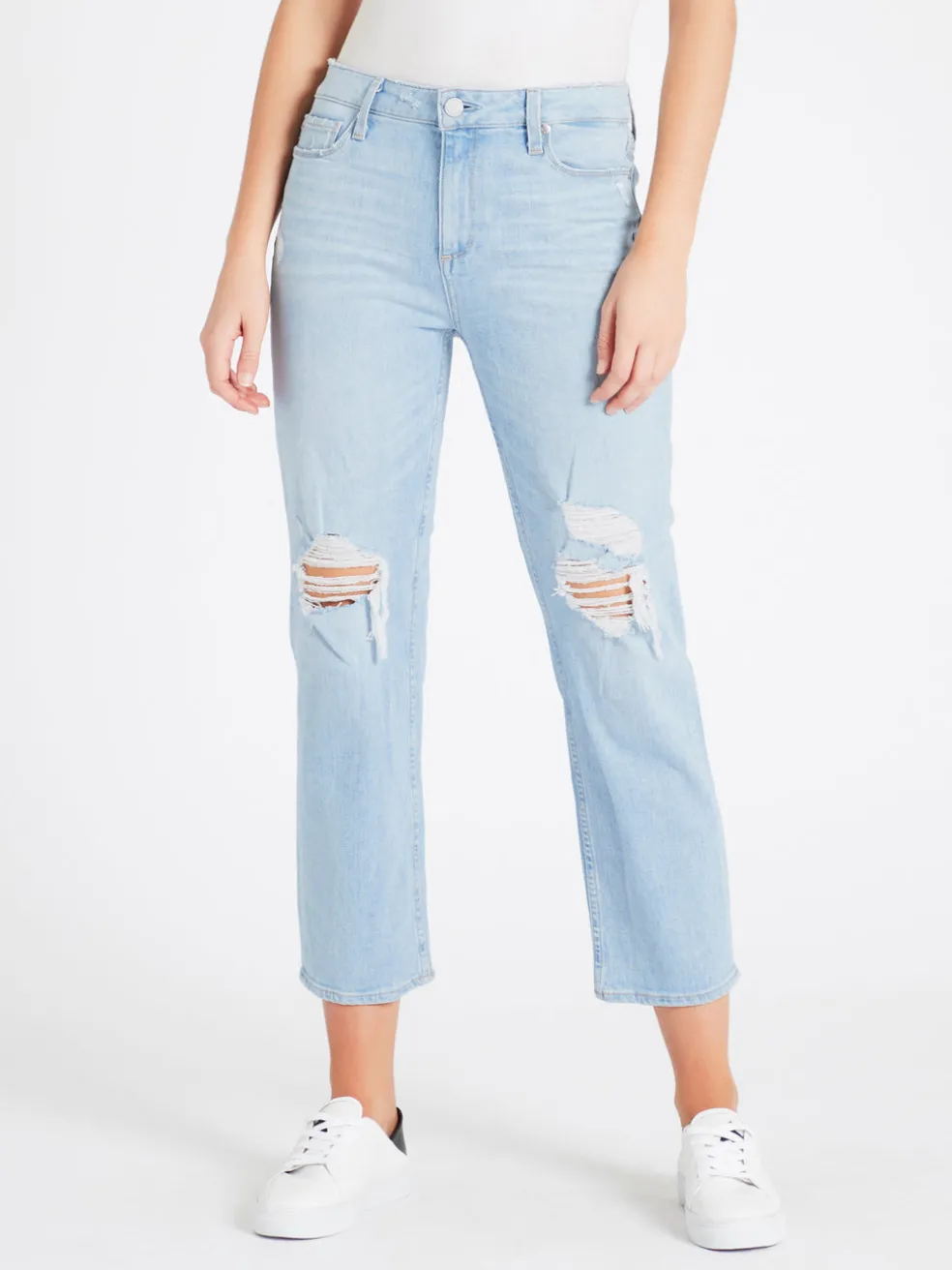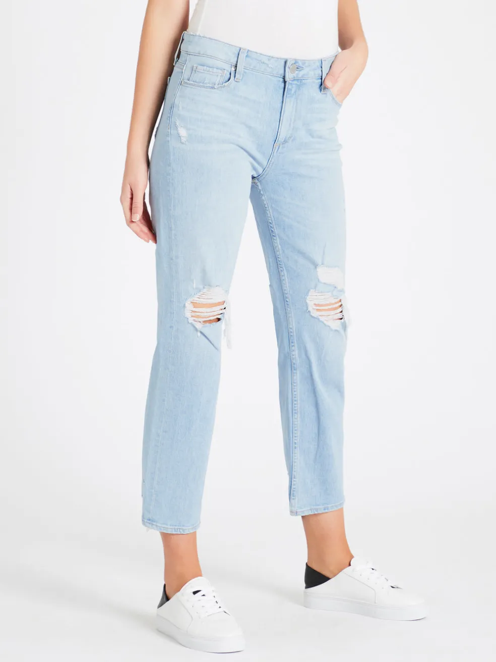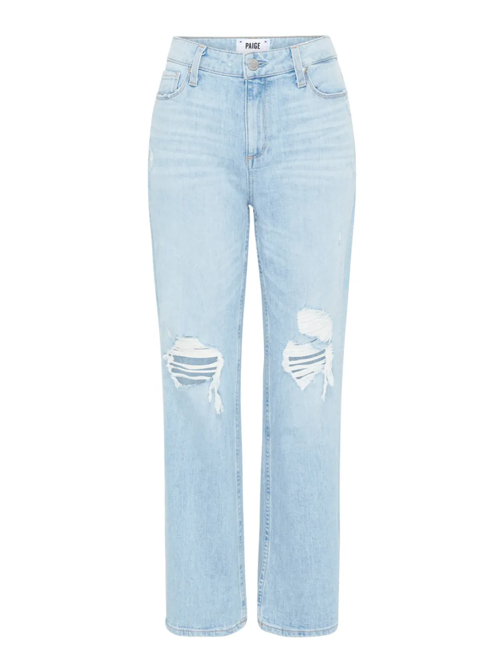 Your ultimate weekend look is here with Paige’s Vintage Inspired Noelle Straight Jean in Myrtle Destructed. Constructed in Pagie’s TRANSCEND VINTAGE denim, these jeans were crafted for a soft fit with a slight stretch for added comfort. These worn in styled jeans feature a single button closure, 5 pockets and destructed knee and hemlines, finished with silver matte hardware.