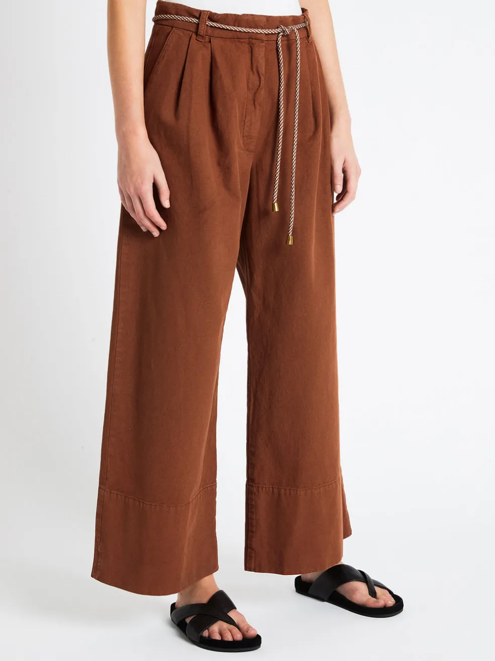 Elevate your day to day style with the Baum Und Pferdgarten Nour Pant in Rusty Brown. Constructed from an organic cotton, linen blend, these high waisted wide leg pant feature duel side pockets, a weave braided self tie removable belt to cinch up through the waist and is finished with a single back pocket. Team with a playful printed blouse or pair back with a simple tee for a style that is versatile.
