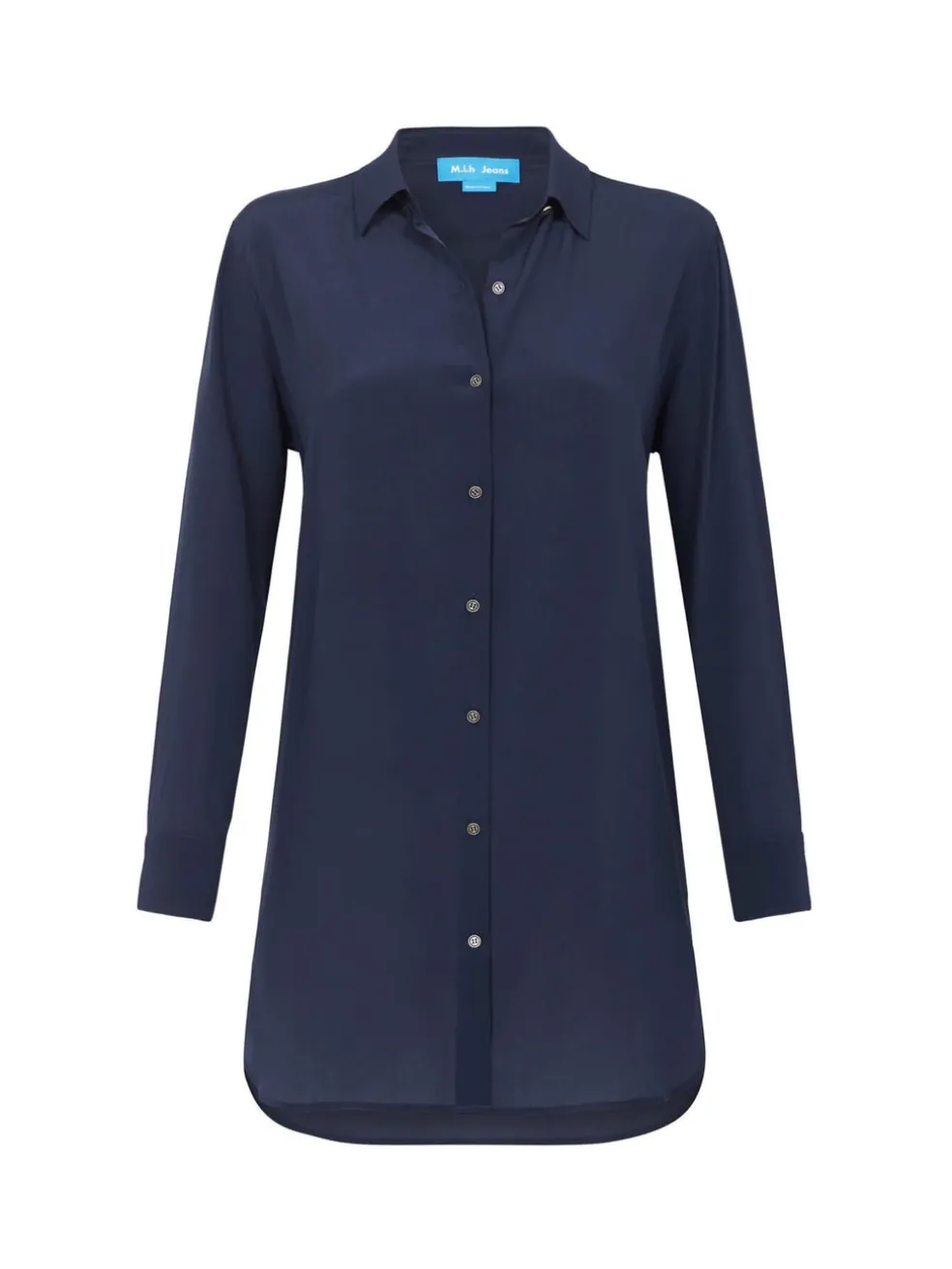 The M.I.H Jeans Oversized Shirt is a slouchy fit style with extra length in the body designed to dip to the mid thigh and below the bum. Constructed here an a lightweight navy blue silk this ultra comfortable piece features an exposed buttons down the centre front opening and at the cuffs. Tuck yours in to your favourite black slim leg pants for a super versatile day to day look.