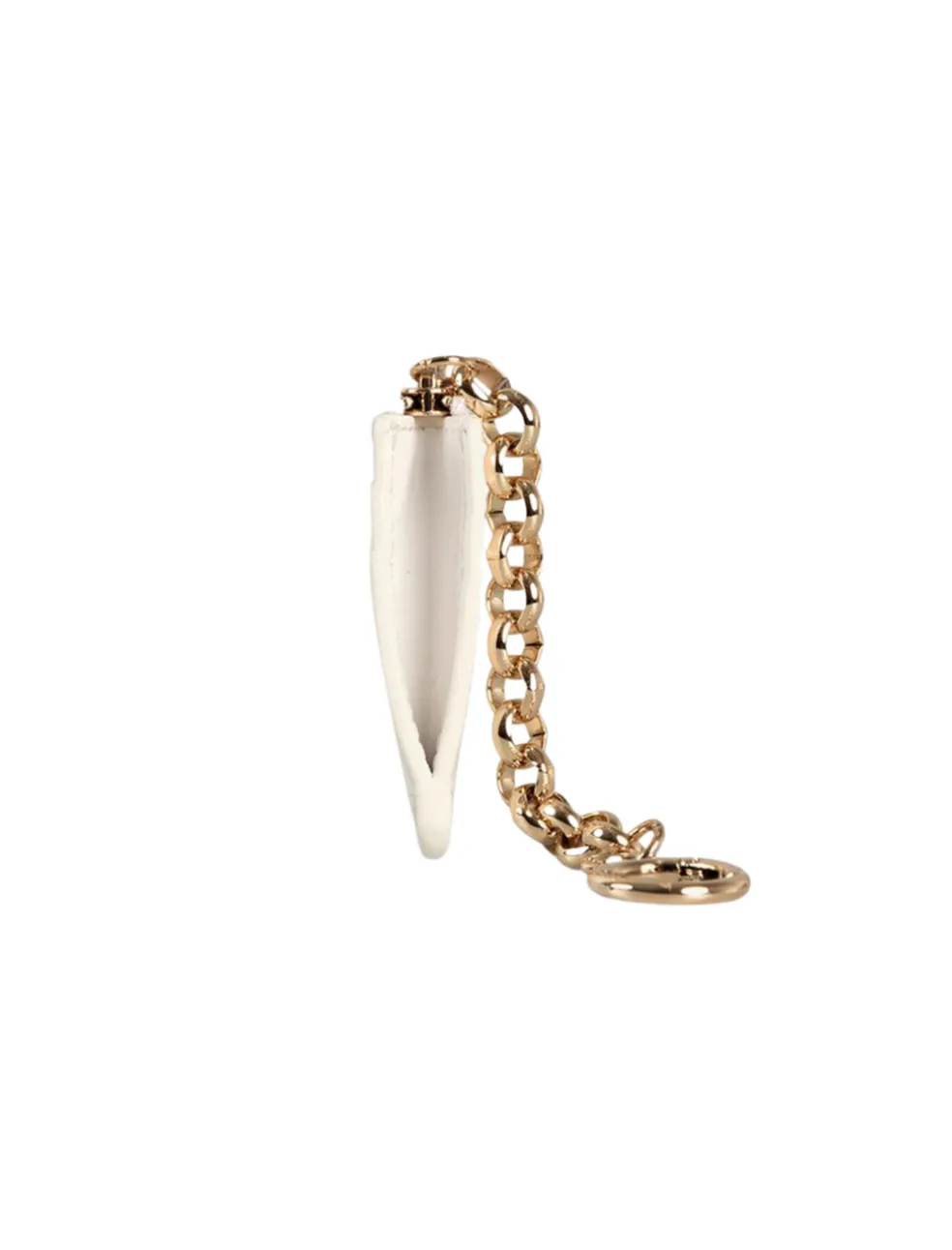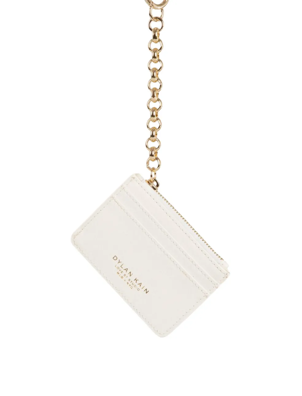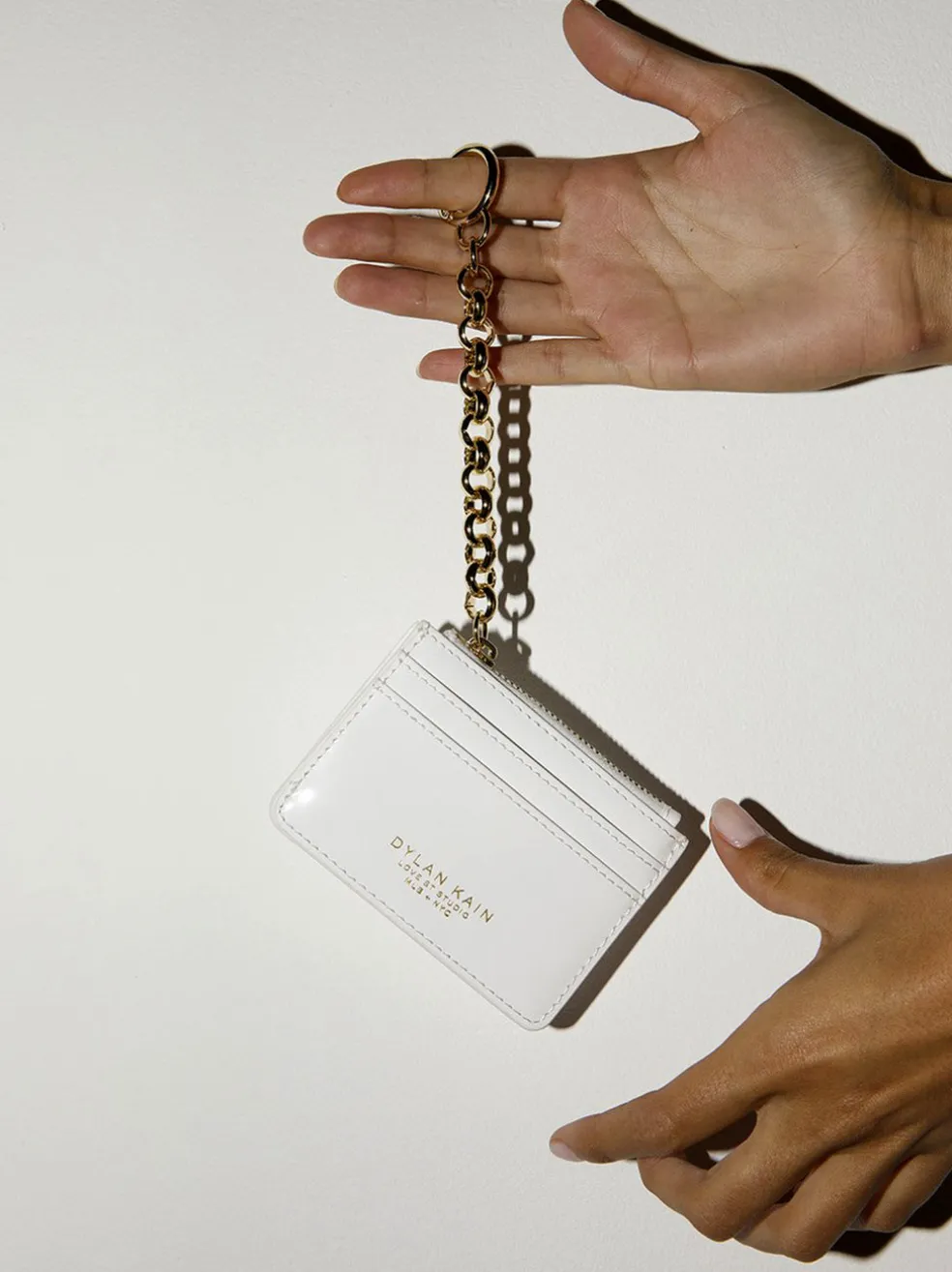 Constructed from Italian leather, the Dylan Kain Palvin Card Holder in White Leather with gold hard wear is the perfect petite sized accessory to keep your cards organised. Small enough to fit into your coat pocket or clip to your favourite handbag this card holder is a year round winner. This piece features four card spaces, a top note pocket, gold chain with spring clip and is finished with contrast white stitching and a print of the iconic Dylan Kain logo