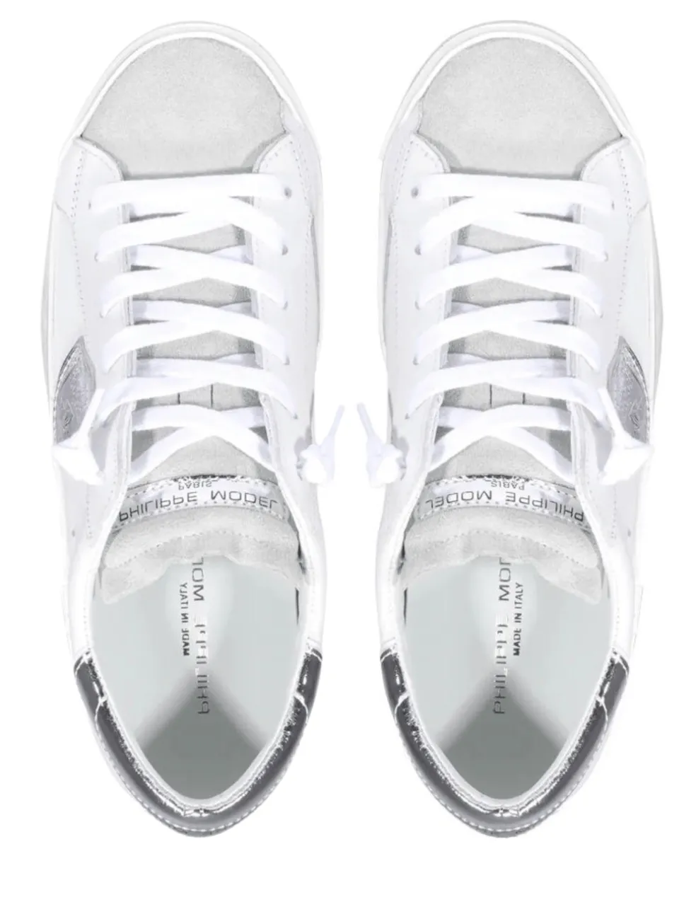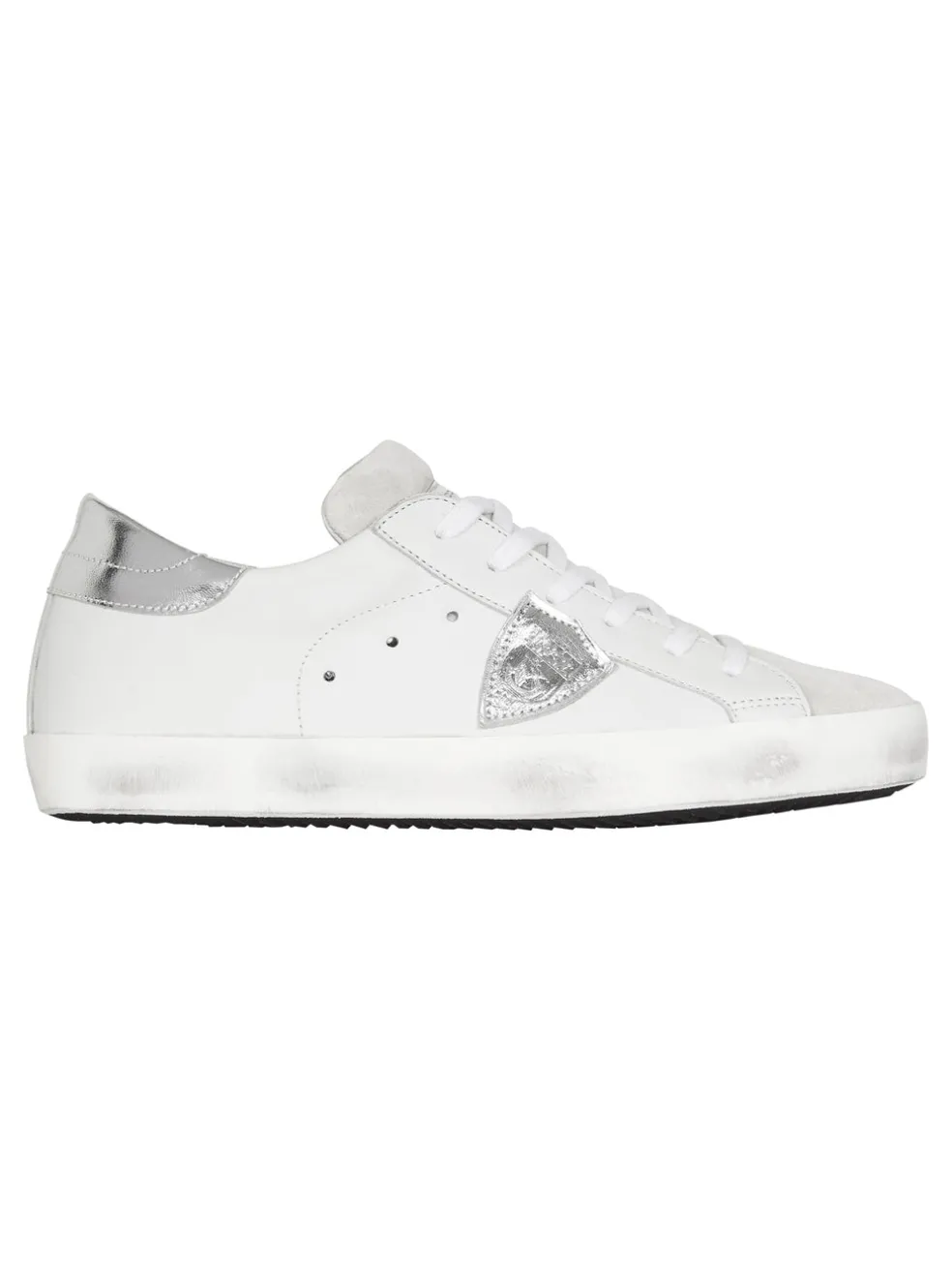 Make a statement in style with the Philippe Model Paris Sneaker in Basic Blanc/Silver. These luxurious sneakers are made with Italian leather and feature purposeful scuff marks around the sole, giving them an ultra-cool grunge-inspired finish that is sure to turn heads.