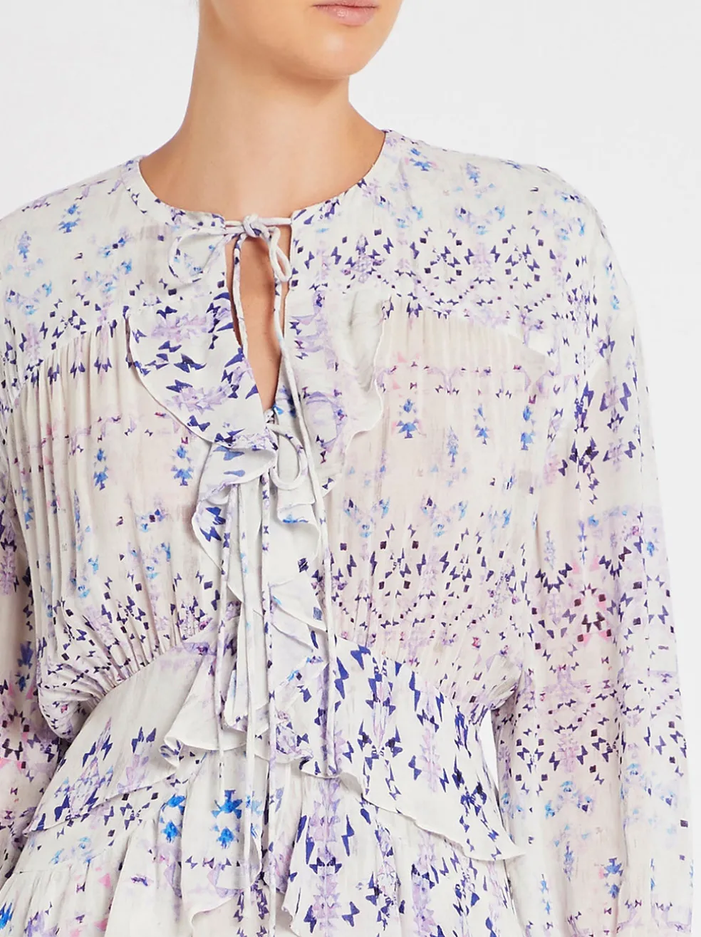 Indulge in the bohemian vibes with IRO’s Persica Dress in Blue. This ethereal dress is the perfect combination of flowy and feminine, with its long, billowing sleeves and layered frill detailing, creating an effortlessly chic peasant-style look.