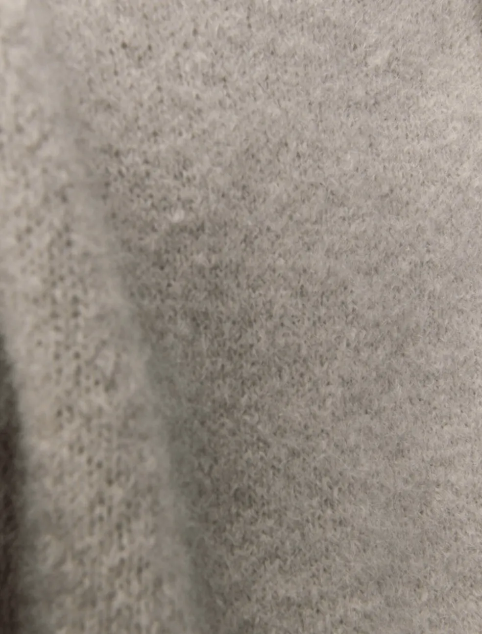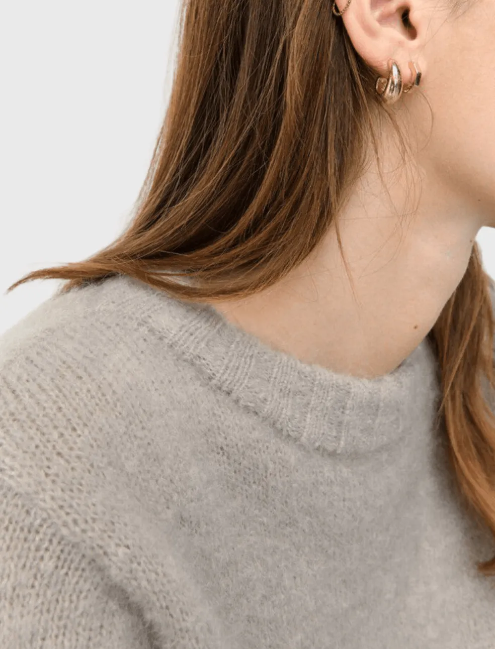 The Pinobery Pullover Sweater is a cute cropped style made from a Mohair Blend. This charming sweater from American Vintage comes here in a soft grey colour called Lama. This knitwear pieces has 7/8 sleeves, a crew neck but a cropped body – perfect for wearing with your high waisted jeans and skirts.